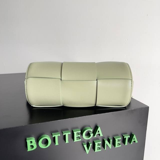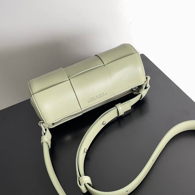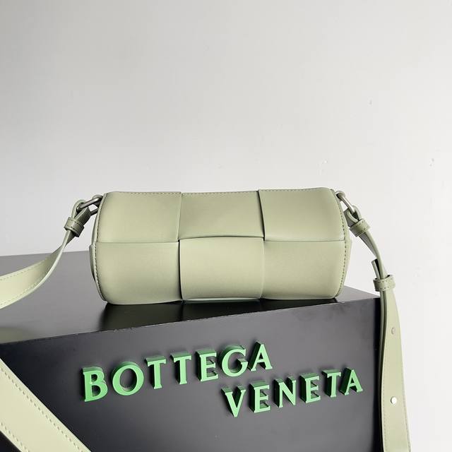 Bv's lucky bucket bag is so cute! The mini version is so adorable! The minimalist, enlarged woven design is both casual and stylish. It's a unisex small cylindrical bag. Available in multiple colors, made with imported cowhide, and features an adjustable shoulder strap. It has ample space for makeup touch-ups. Style number: 741561. Size: 22*6.5*15.5cm. Color: Travertine Green.