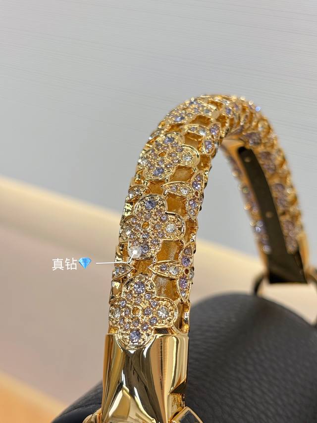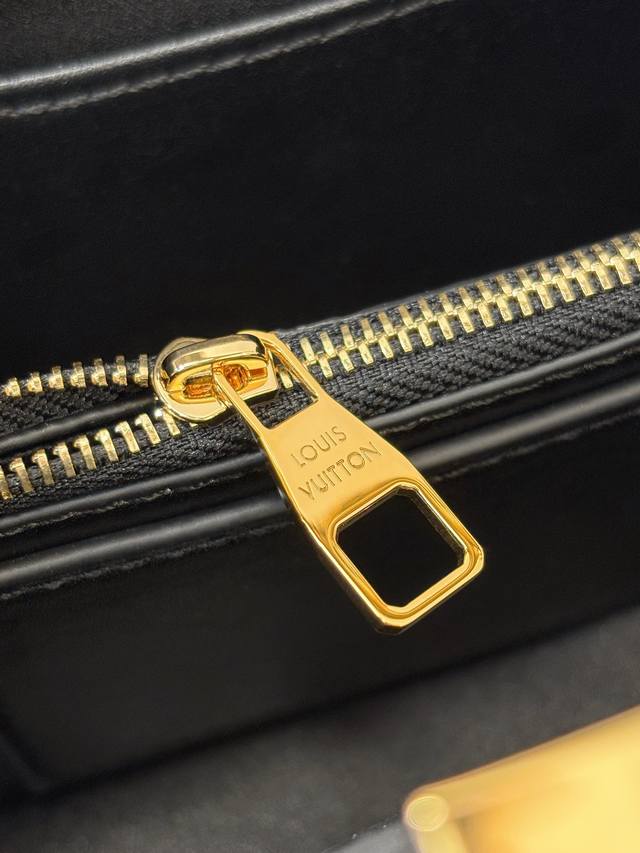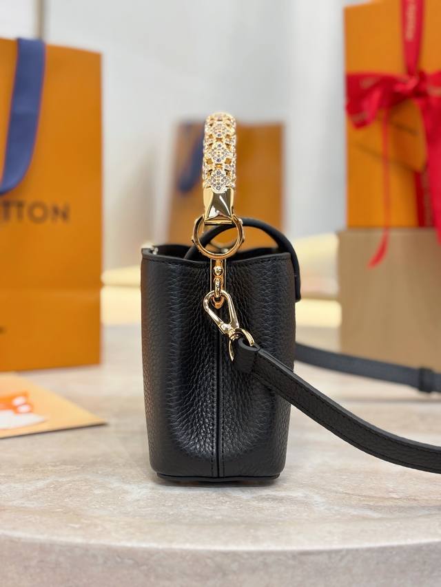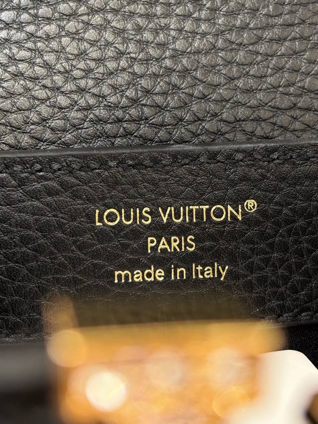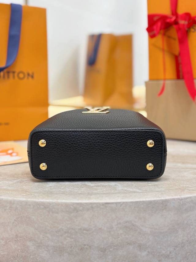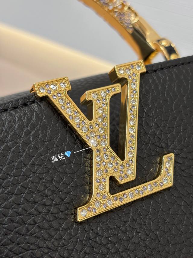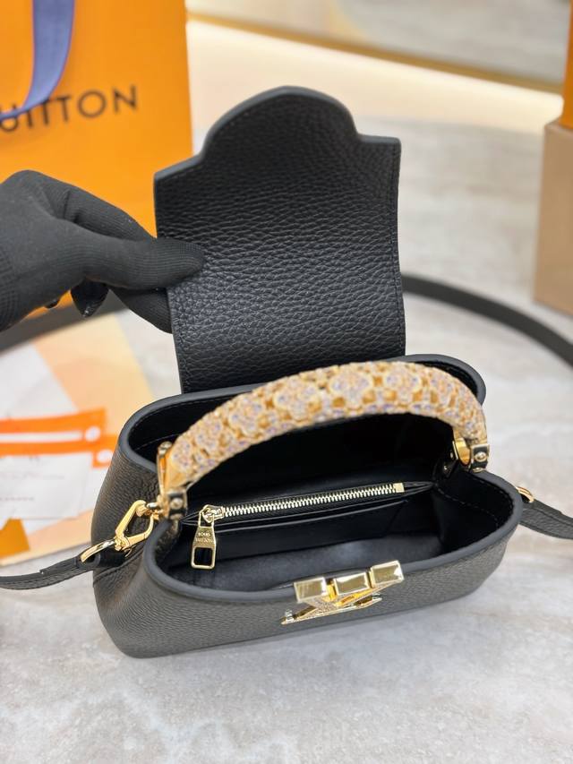 Capucines Mini Handbag DDD M14177 Black DDD This Capucines mini handbag is from the Exceptionals series. Made of Taurillon calfskin, it's a collector's item. Rhinestones add a jewel-like touch to the L* letter, creating a dazzling effect. The floral handle echoes the classic Flower Crown necklace design, allowing for multiple carrying options. The flap can be worn inside or outside. Size: 21 x 13.6 x 8 cm DDD