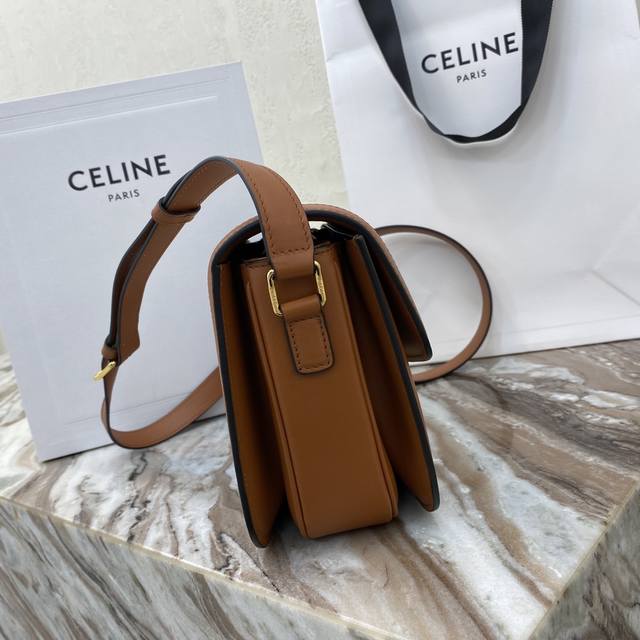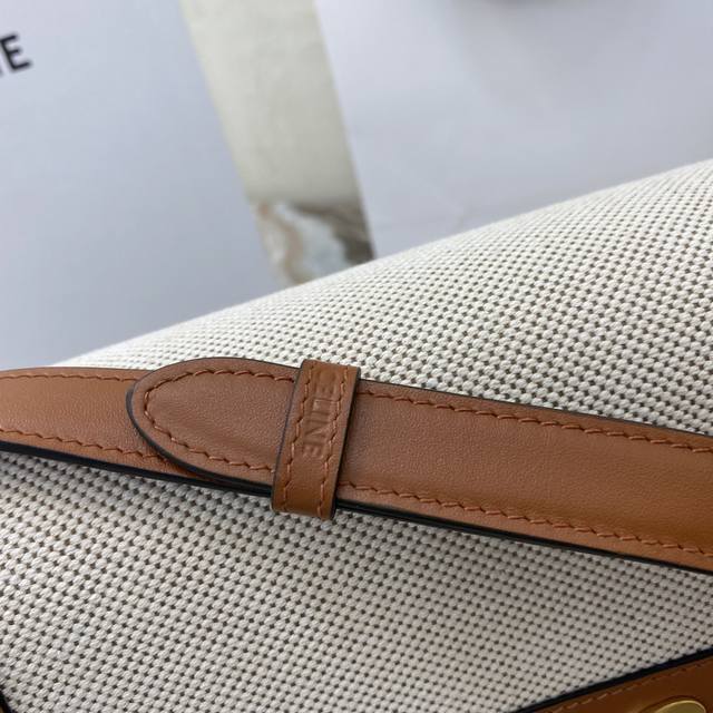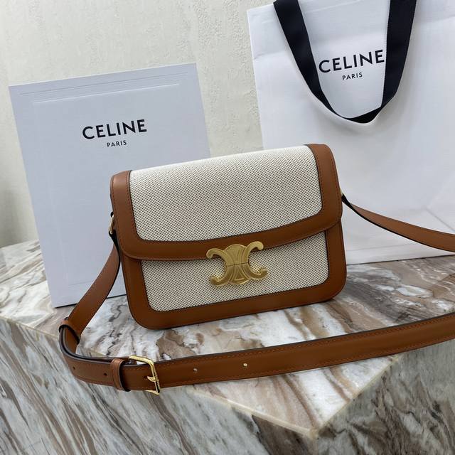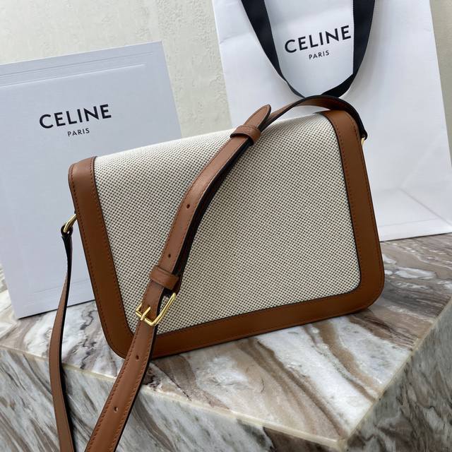 Celin. Triomphe Medium Canvas and Calfskin Shoulder Bag 9 x 6 x 3 inches 22 x 16.5 x 7 cm