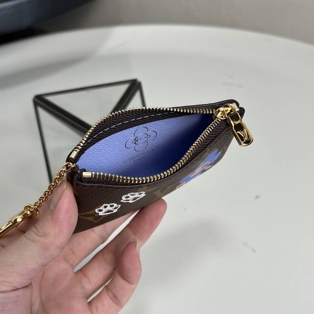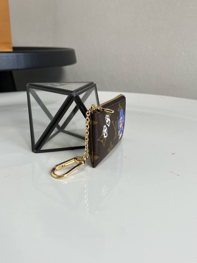 Chip Version Top-Tier Original M15341 Silkscreen Christmas Monogram Key Pouch Launch. This key pouch reinterprets a classic piece in Vb&N's Winter Travel Collection, showcasing a charming design. It features a signature monogram canvas material. Two foot prints are flanked by an illustration of the house's iconic mascot, Bean. A gold key hook adds a touch of sophisticated style to the compact design. Lined in blue frosted leather. 12 x 7 x 1.5 cm DDD