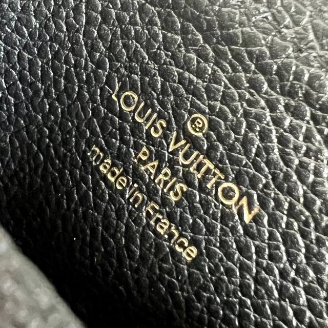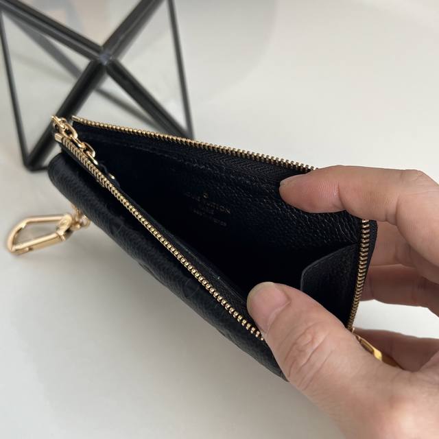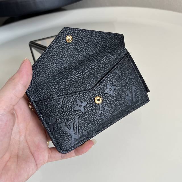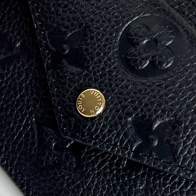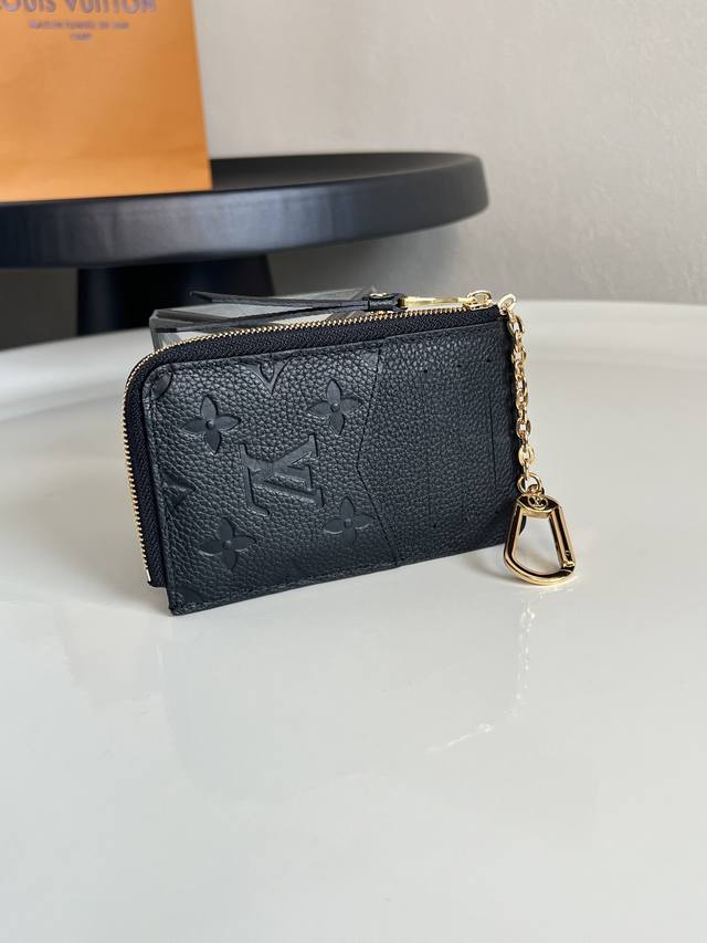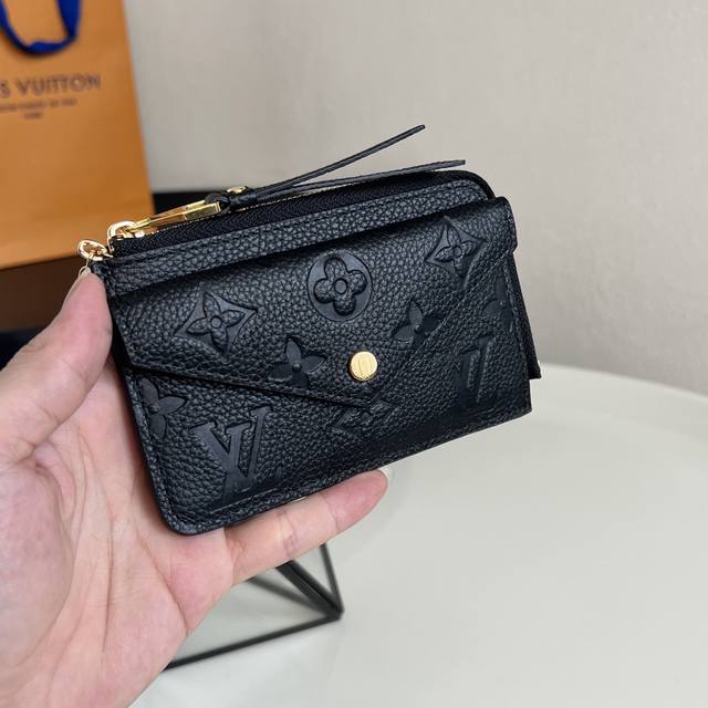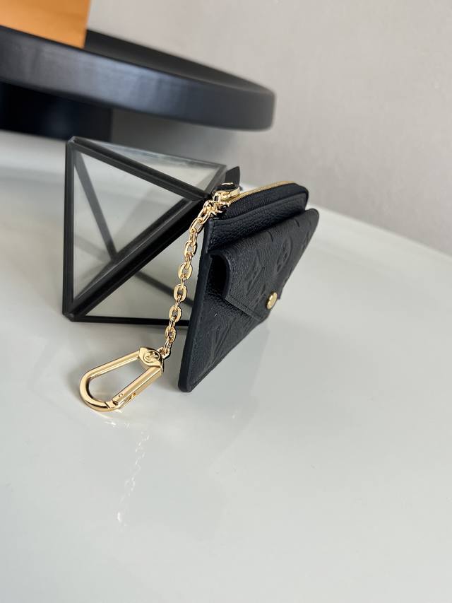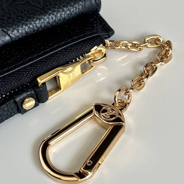Chip-enabled M69421 Black Recto Verso Card Holder is crafted from Monogram Empreinte leather. It features an L-shaped wide zipper opening to reveal a coin compartment, a central pocket for folded banknotes, an envelope-style front pocket, and card slots. It can also be secured to a handbag or belt with hooks. Dimensions: 13.0 x 9.5 x 2.5 cm. DDD
