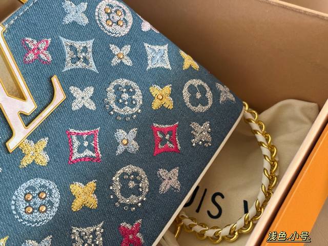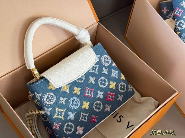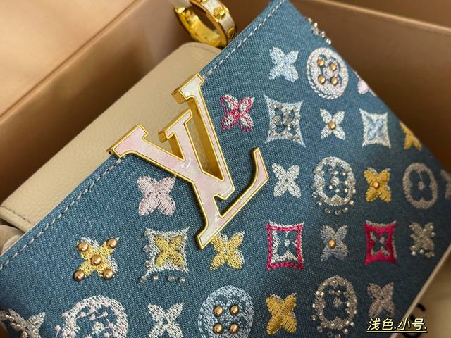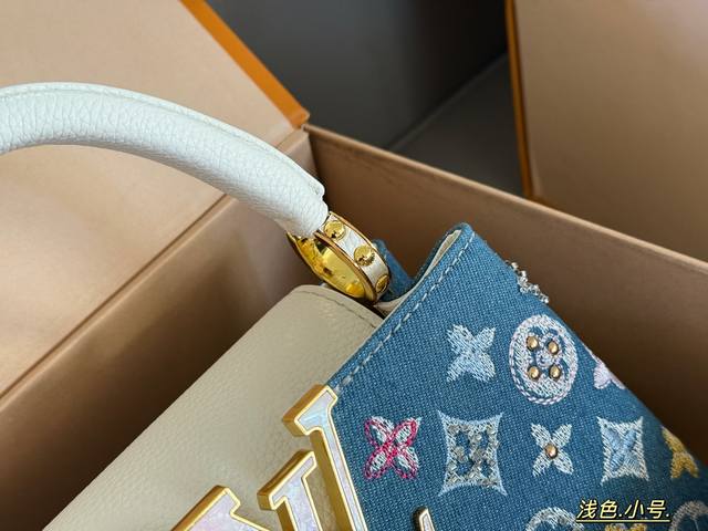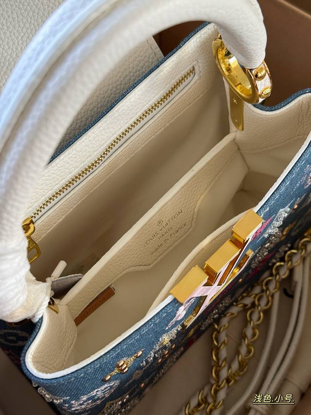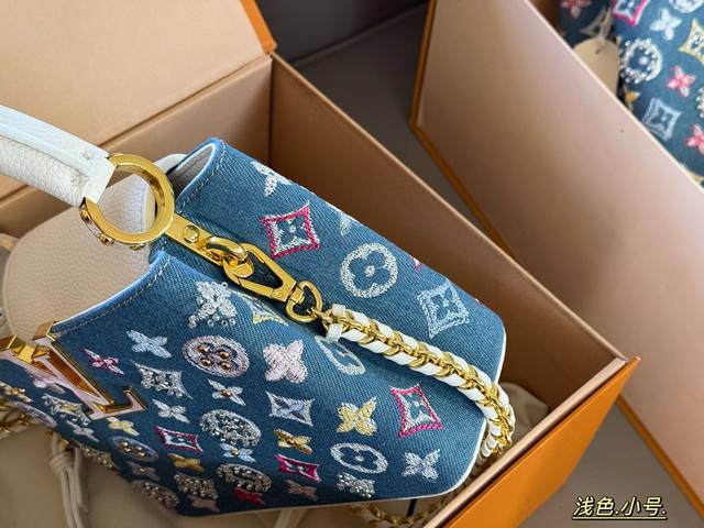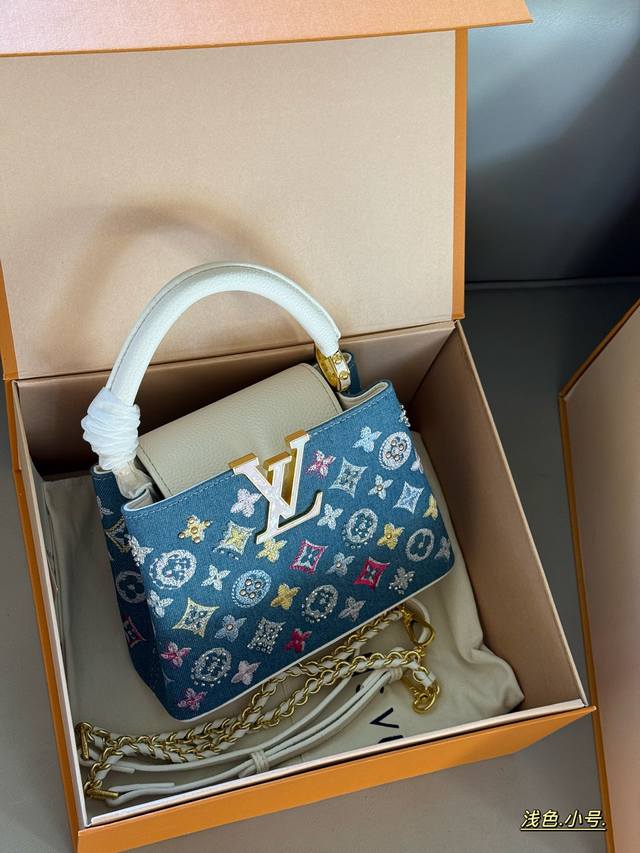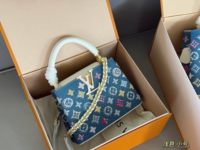 Comes in a box. Size: 22*13cm (small), 28*17cm (large). L's Capucines handbag. Taurillon denim with rhinestones! Understated yet luxurious! Classic! Classic!