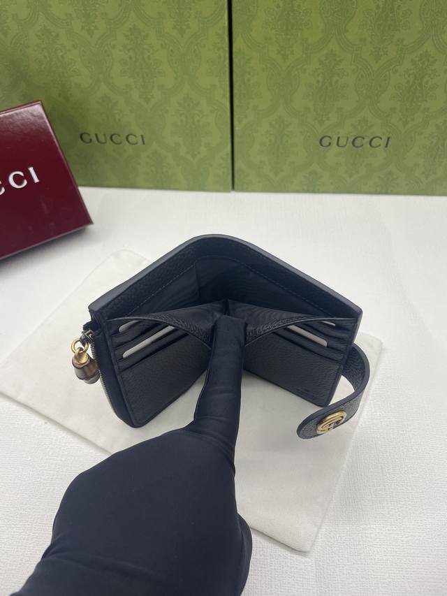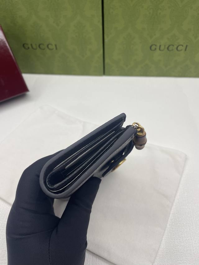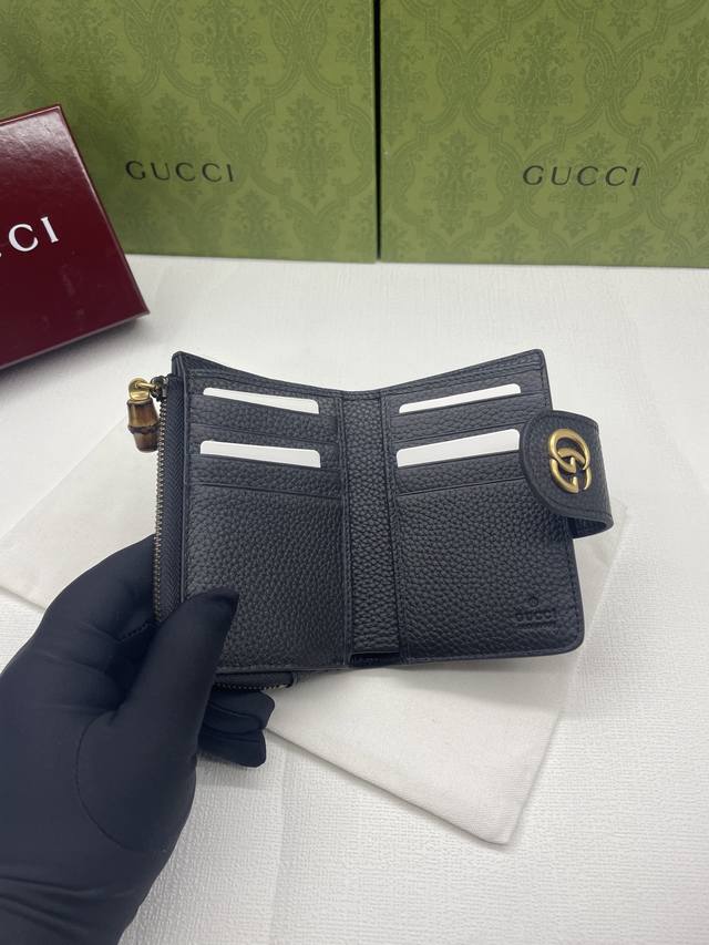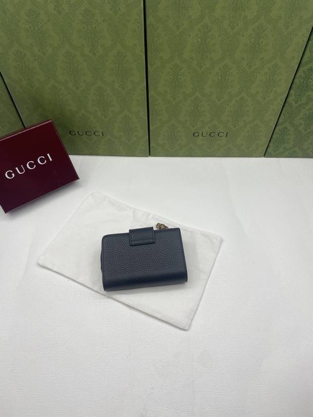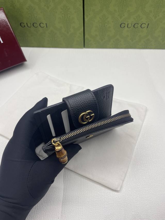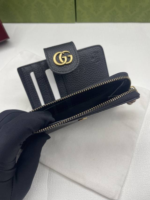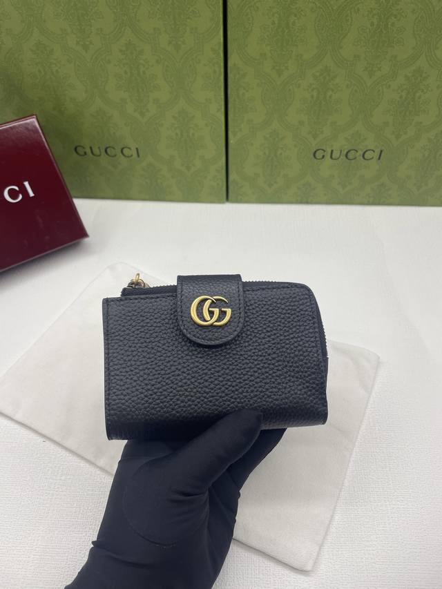 Comes with a green box. This Gg Marmont wallet is crafted from classic, timeless black leather, adding another classic piece to the Aria-Aria collection. The double G hardware, inspired by 1970s belt buckle designs, is reimagined on this wallet using a tonal resin. The combination of classic design and monochromatic color scheme highlights a modern and stylish look. Model: 739498 Dimensions: 13*8.5*2Cm DDD