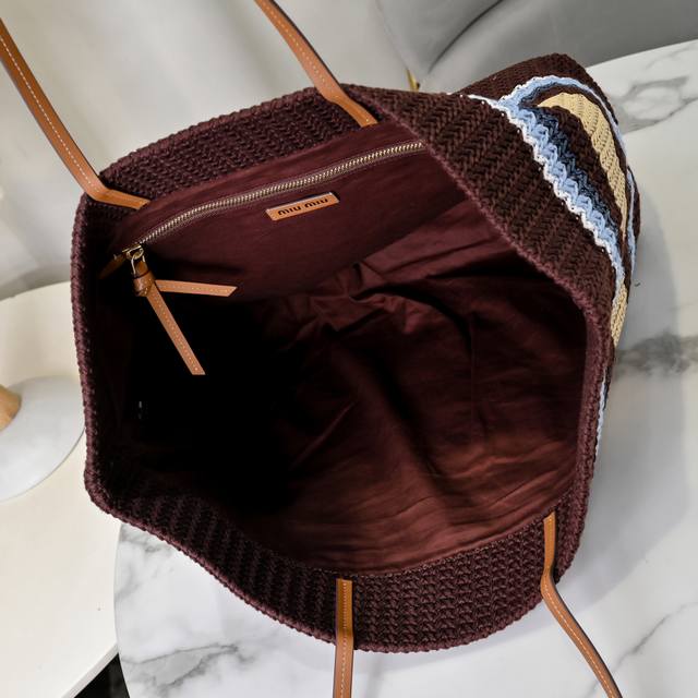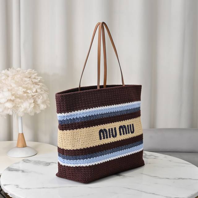 configuration counter full set packaging M home 5Bg228, imported raffia straw patchwork cotton thread woven tote bag, the only version of the market quality, front signature Miumiu embroidery, cotton lining, ultra-light, large capacity, a must-have for travel, suitable for all seasons, super beautiful in real life, size: 40X34X16Cm.