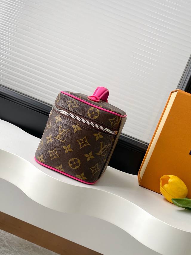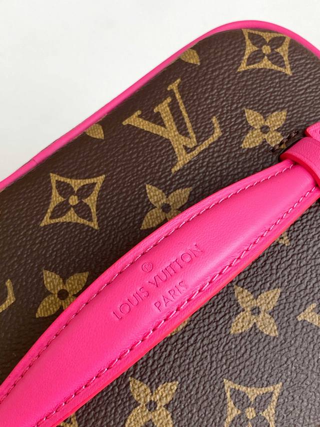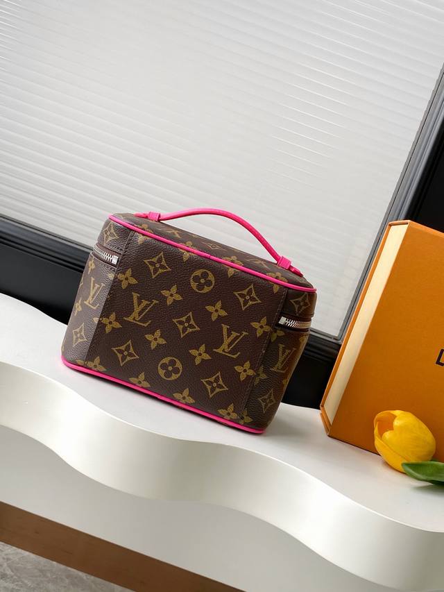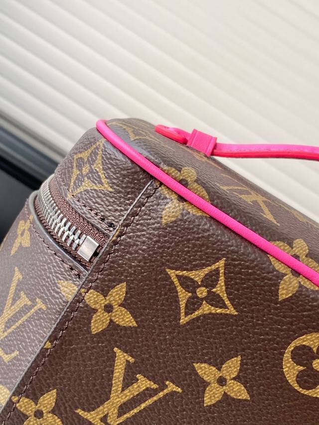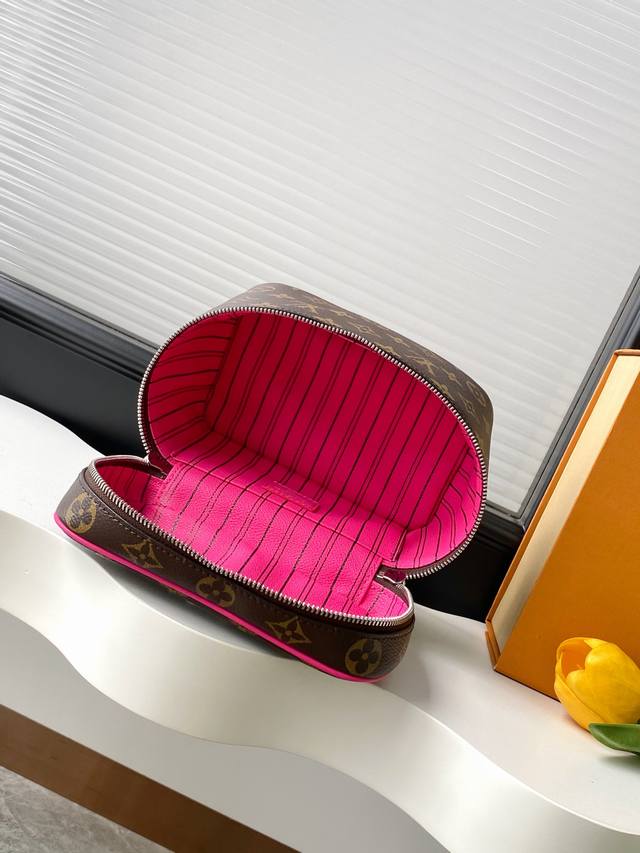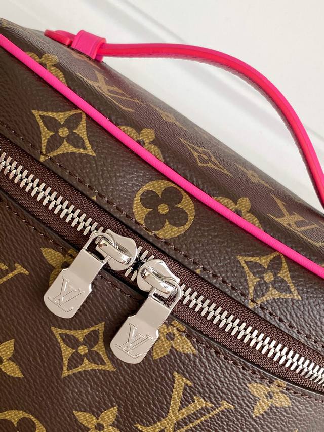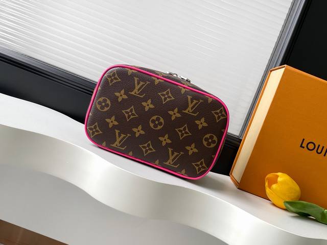 This Nice Mini Cosmetic Bag is made of Monogram Macassar coated canvas to create a compact configuration that can be easily placed in a travel bag. The top trim, leather handles and washable lining are rendered in bright colors, and the striped pattern inside cleverly recalls the classic design of the brand archives.