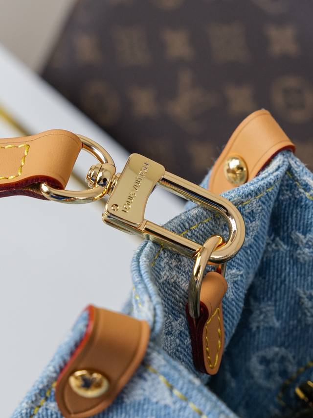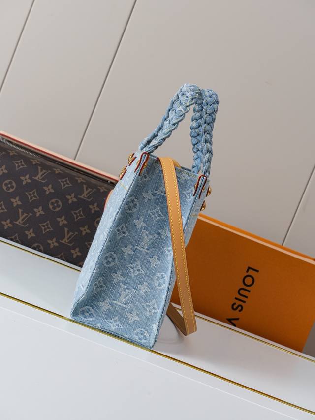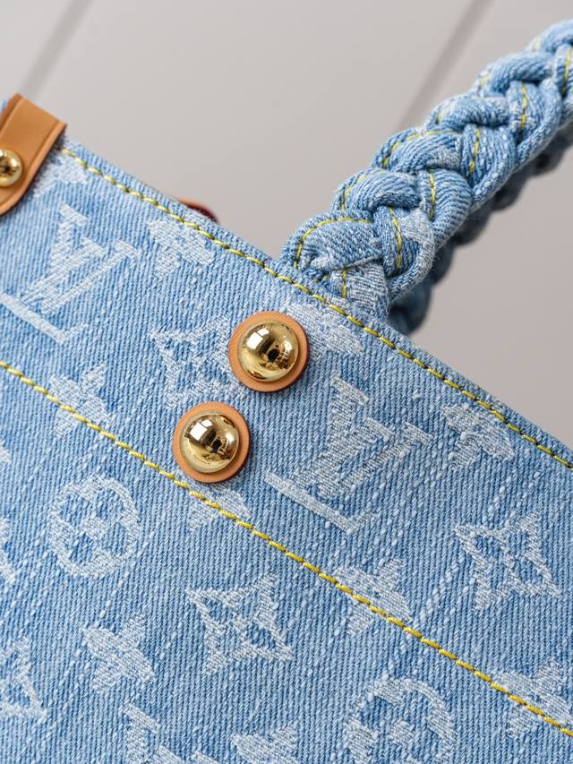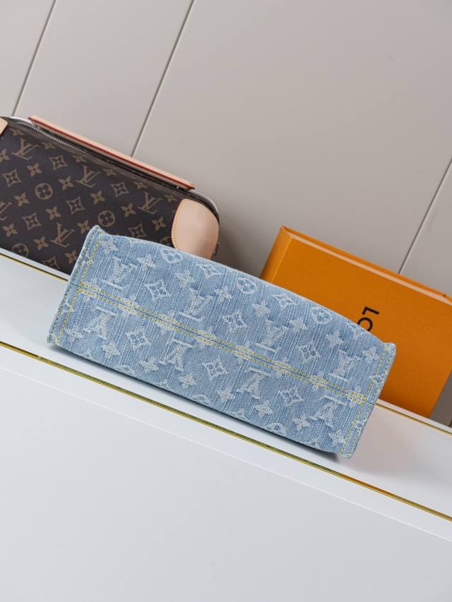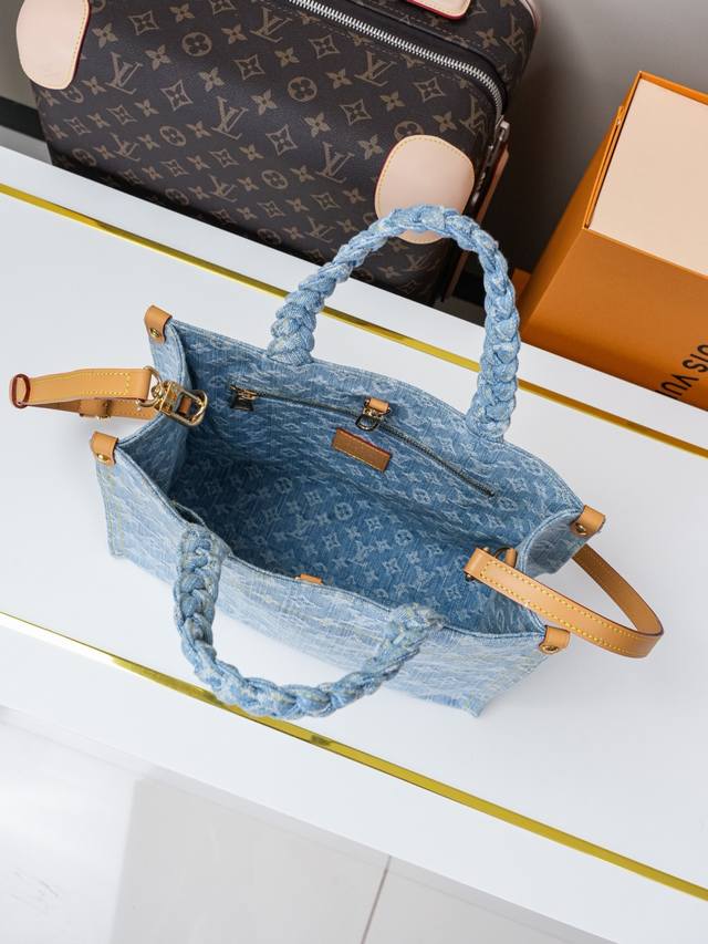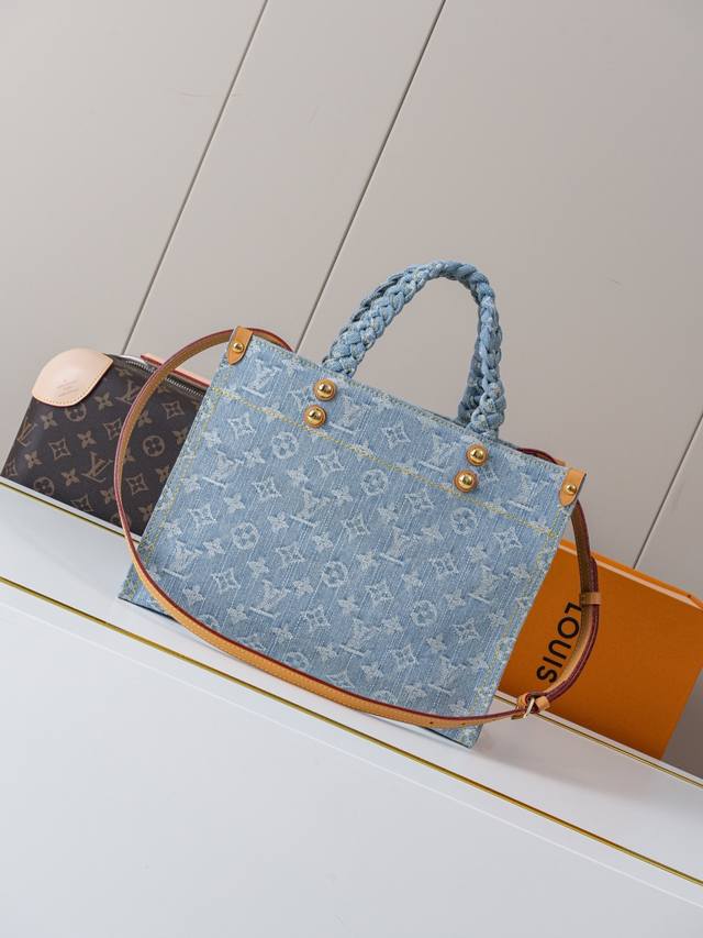 Dynamic 163C01 Chip M24897 Top-Quality Denim Original Home Background Photo. The Let Go Small Tote Bag, inspired by the Onthego handbag, exudes a summery vibe with its washed Monogram Denim colorway and braided handles, accented with cowhide rivet corners. The soft construction provides comfortable carrying and accommodates a wallet and phone. The gift box packaging for this product may vary depending on inventory availability and may differ from the packaging shown on this product page. Please refer to the actual gift box packaging received for details.