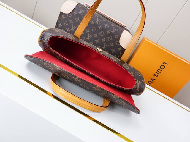 Dynamic 163C01 Chip M51902 Monogram Top Original Individual Background Real Shot Vintage Bag Baguette Handbag This handbag features a vintage baguette flap with a magnetic snap closure, a red suede lining, and a small side compartment. Dimensions: 28
