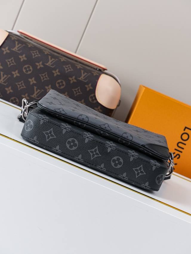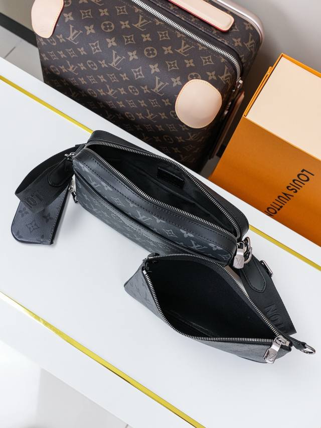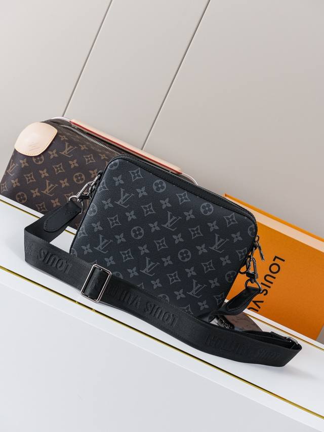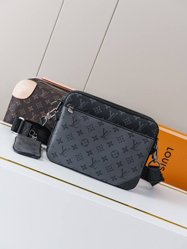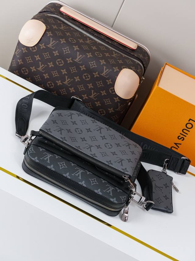 Dynamic 163C01 Chip M69443 New Edition, Top-Quality Original, Home Background Photo. The Trio Messenger Bag is crafted from Monogram Eclipse and Monogram Eclipse Reverse canvas. The signature tonal pattern highlights the lines of this versatile, modular design. In addition to its traditional crossbody functionality, it features a removable zippered pocket and a coin purse attached to the strap. Dimensions: 25.0 x 18.5 x 7.0 cm (L x H x W).
