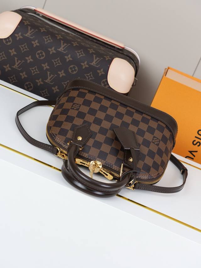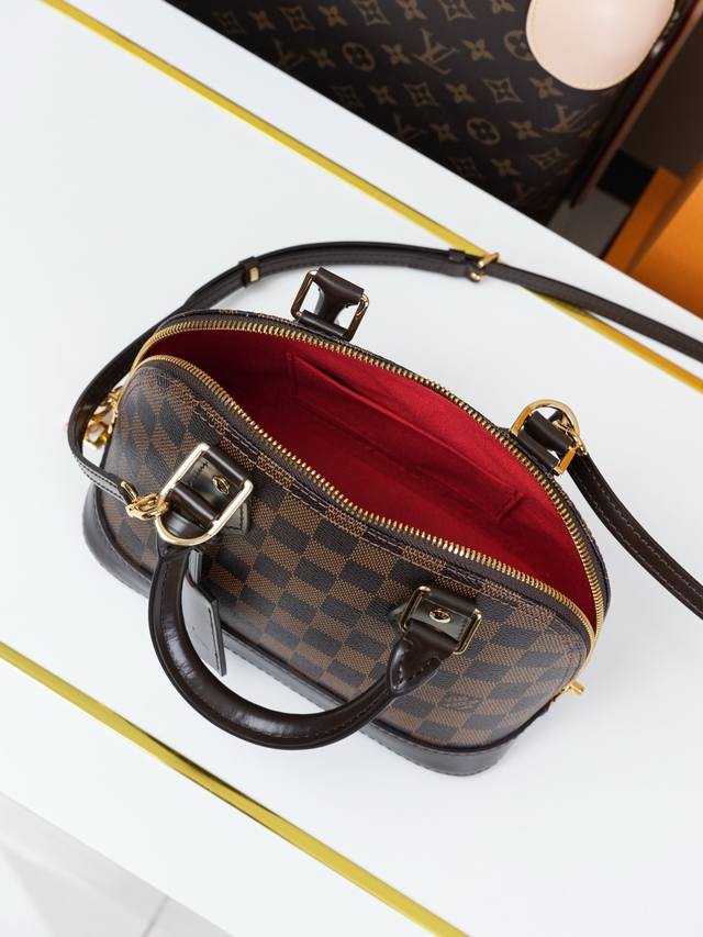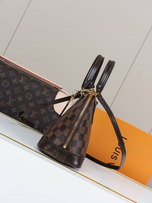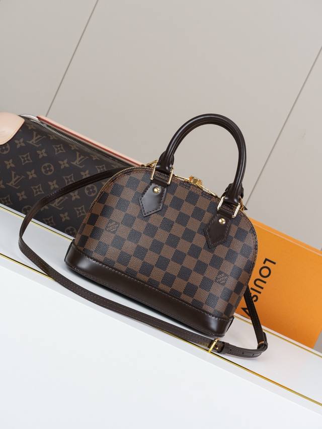 Dynamic 163C01 Chip N40606 New Brown Version with Adjustable Shoulder Strap Top Original Individual Background Real Shot This Alma BB handbag traces its roots back to the Art Deco style of 1934, crafted with Damier Ebene canvas to create an elegant silhouette. A striking padlock and key, Toron double handles, and a leather key pouch add classic touches, while the detachable and adjustable shoulder strap allows for convenient crossbody wear. Dimensions: 23.5 x 17.5 x 11.5 cm (Length x Height x Width) Made of Damier Ebene coated canvas. Features smooth cowhide leather trim, fabric lining, metal hardware, double zipper closure, padlock, key pouch, interior slip pocket, and metal studs. Holds a 6.7-inch smartphone, earphones, lipstick, tissues, keys, and sunglasses. Shoulder strap: Detachable and adjustable. Strap half-length: 50.0 cm. Strap half-length adjustable to: 62.0 cm. Handles: Double handles.
