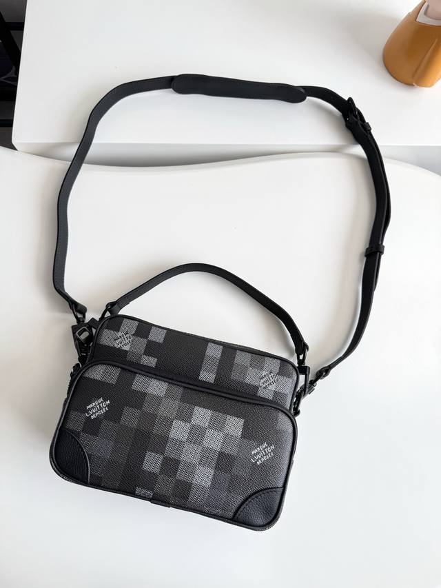 Dynamic chip with counter packaging. Exclusive photos of the original overseas M14988! This Nil messenger bag features Damoflage Black coated canvas, a reimagined interpretation by Pharrell Williams. It blends the designer's cutting-edge perspective with the brand's traditional creativity, creating a camouflage-like pixelated Damier pattern. A zippered front pocket and main compartment complete the functional design. Dimensions: 25 x 17.5 x 11 cm