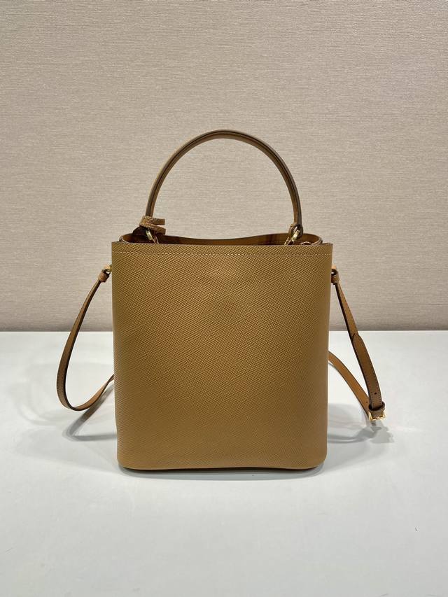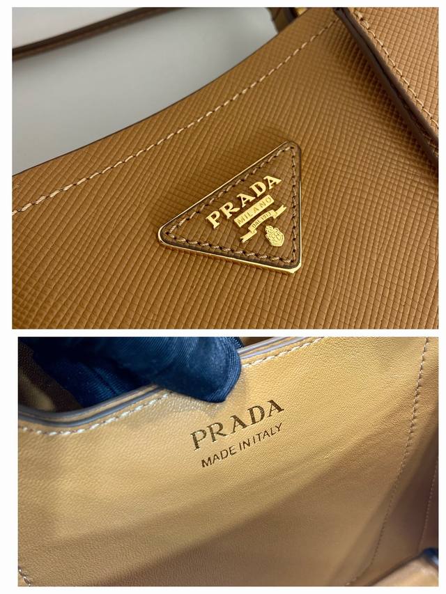 is made of imported Saffiano leather, featuring a detachable shoulder strap, a leather nameplate, and a metal logo. The leather-wrapped center pocket with a magnetic closure features a Saffiano leather triangle logo and contrasting nappa leather lining. This Double bag is elegant, striking, and unique, and is another popular model. It measures 22cm long, 23cm high, and 13cm wide.