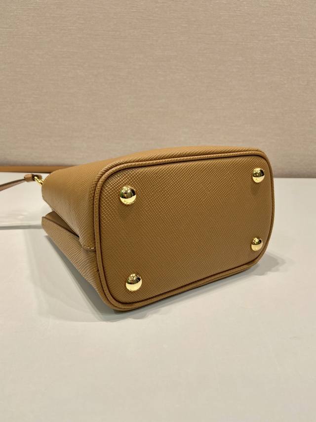 Exclusive and exclusive to the counter, the mini size 1Ba217 is made of imported Saffiano leather, featuring a detachable shoulder strap, a leather nameplate, and a metal logo. The leather-wrapped center pocket with a magnetic clasp fastens, and the Saffiano leather triangle logo and contrasting nappa leather lining are featured. This Double bag is elegant, striking, and unique, and is another popular model. It measures 17cm long, 18cm high, and 10.5cm wide.