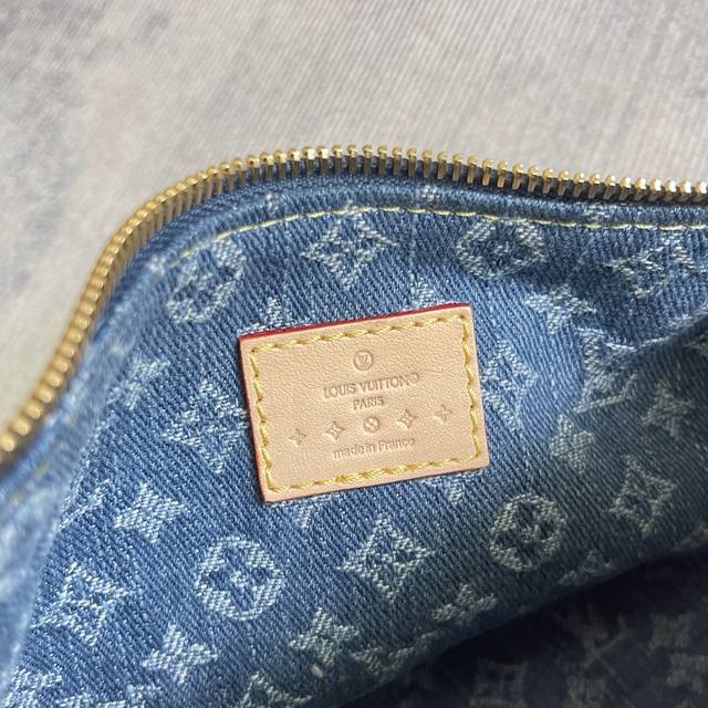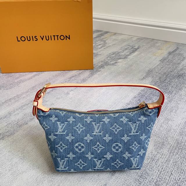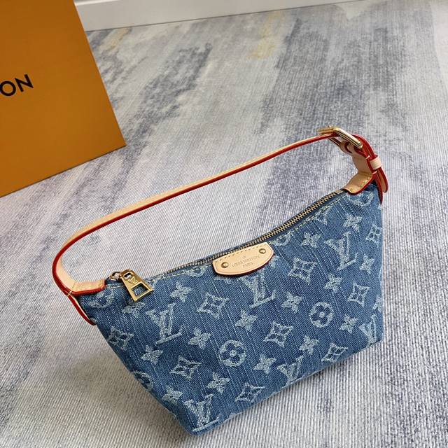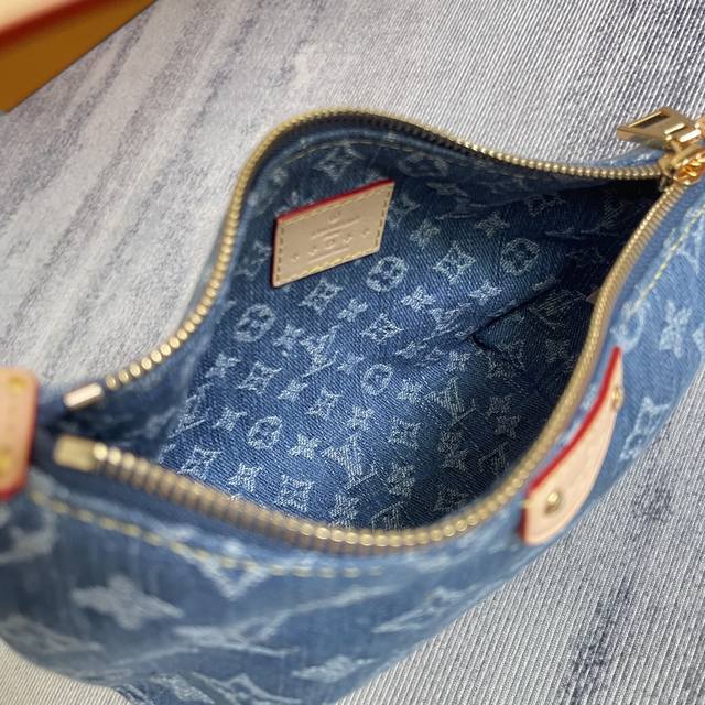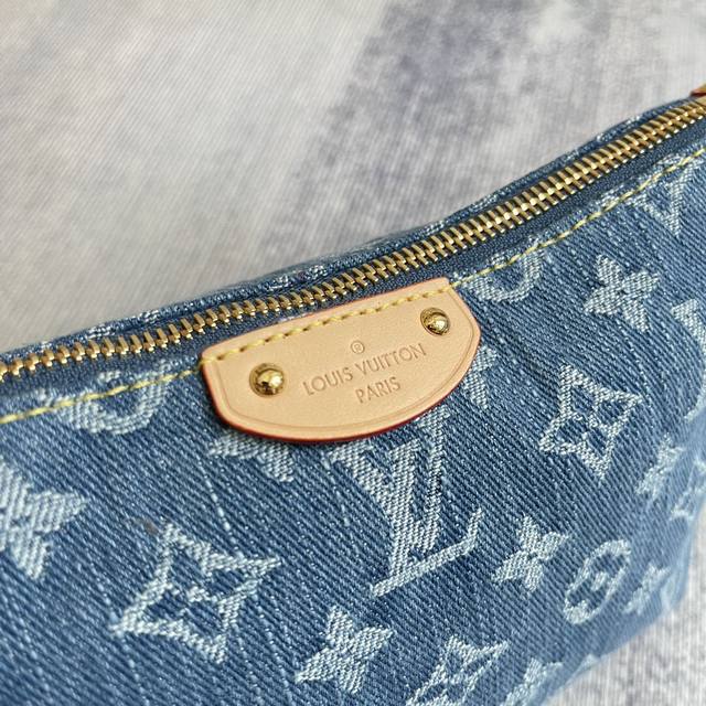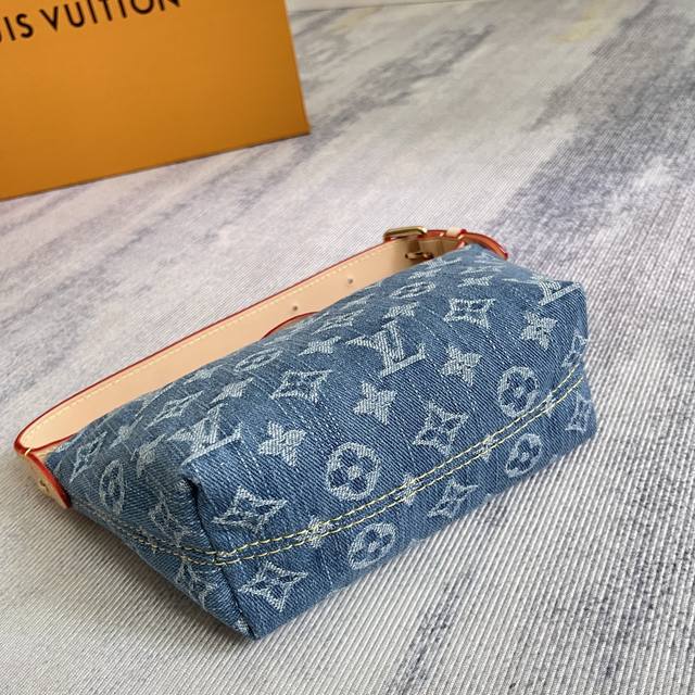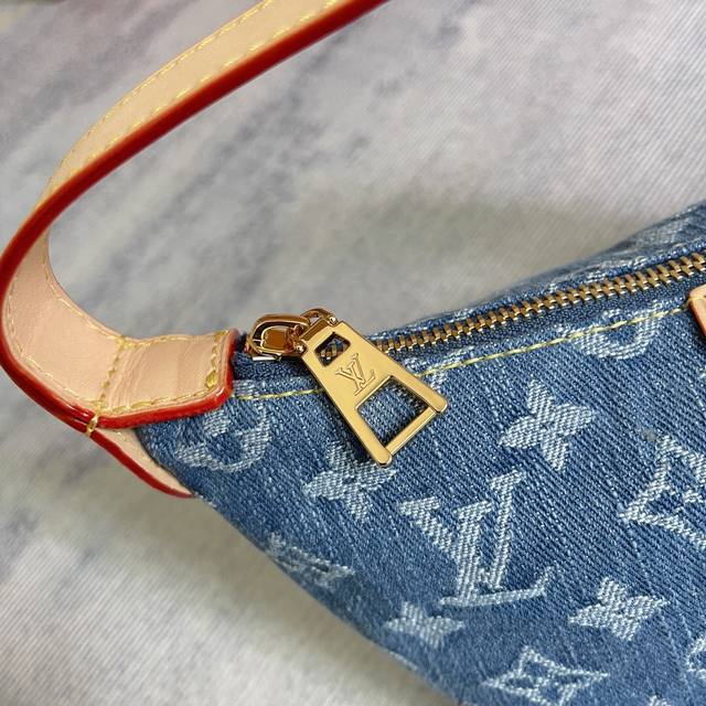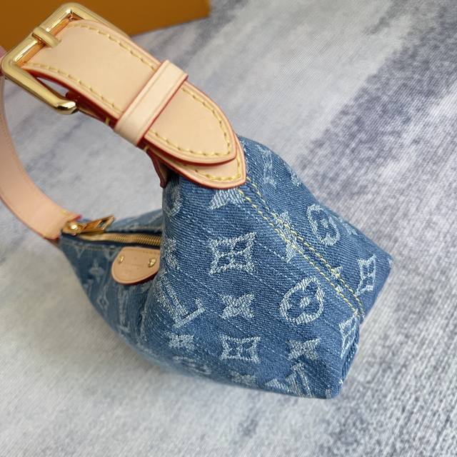 Exclusive custom photo of the original, enhanced chip version M82949 blue denim Mini Moon handbag in soft Monogram Empreinte fabric with embroidered denim. A pea bag, croissant, and small shoulder bag in lemon yellow. Adjustable shoulder strap for shoulder, elbow, and hand carry. 20.5 x 6 x 16 cm (Length x Height x Width