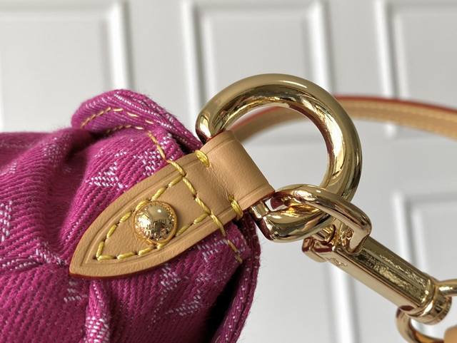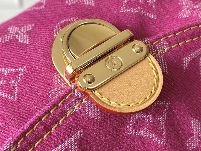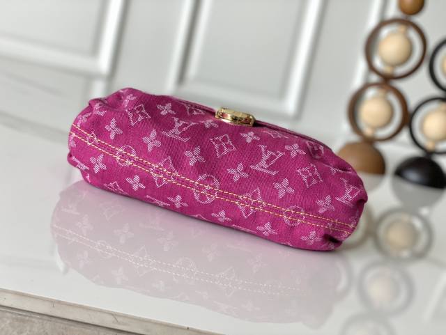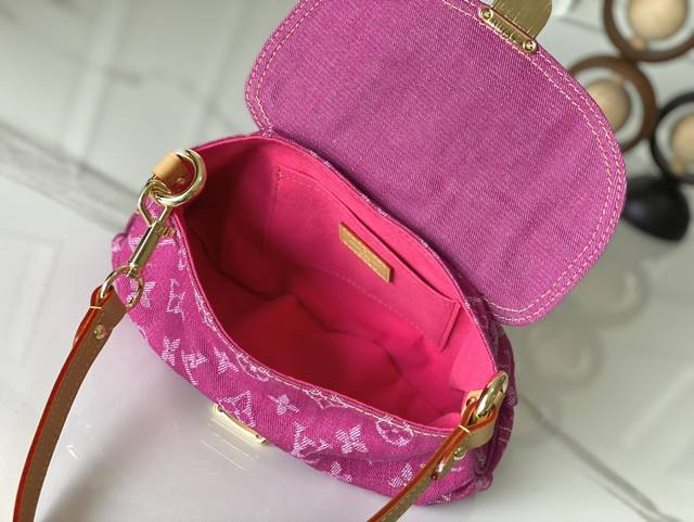 Exclusive photo of the variable-code chip version. This model is the M95216 purple denim small shoulder bag, a vintage, limited edition. Made of denim canvas, soft suede lining, front snap-lock flap closure, small pocket, zipper closure, and adjustable shoulder strap. Dimensions: 26x15x9cm