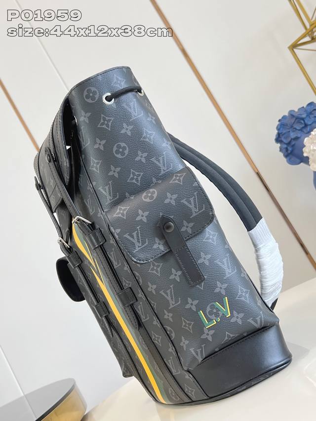 Exclusive photo p2550. The Christopher Medium Backpack in green draws inspiration from mountaineering. Spacious side pockets and a drawstring closure enhance its stylish design, making it a stylish choice for both work and leisure. Add colorful stripes, custom monograms, and brand prints to further enhance the Mon Monogram collection's personalized style. 44 x 12.5 x 38 cm (H x W x L)