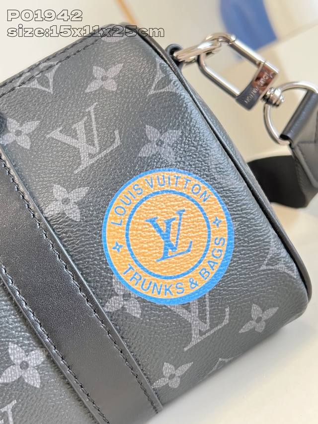 Exclusive photos of this Keepall 25 bag crafted from Monogram Eclipse canvas for a compact silhouette, freely embellished with Monogram prints, stripes, signature monograms, and patches, unleashing your own personal flair. Leather side straps and a designer branding add trendy details, while a removable and adjustable shoulder strap offers versatile carrying options. 15 x 11 x 25 cm (H x W x L)