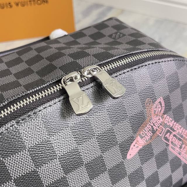 Exclusively customized, real photos of the premium original enhanced version M45275. This Discovery backpack is crafted from Damier Graphite canvas and depicts wildlife in a passport-stamp style, telling the migratory story of giraffes, elephants, and tigers. The tiger at the front of the pack celebrates the Lunar New Year of the Tiger. Dimensions: 37 x 40 x 20 cm.