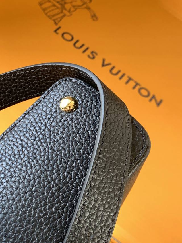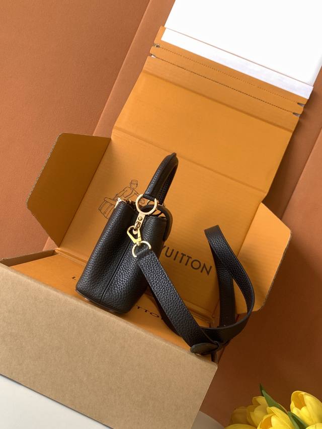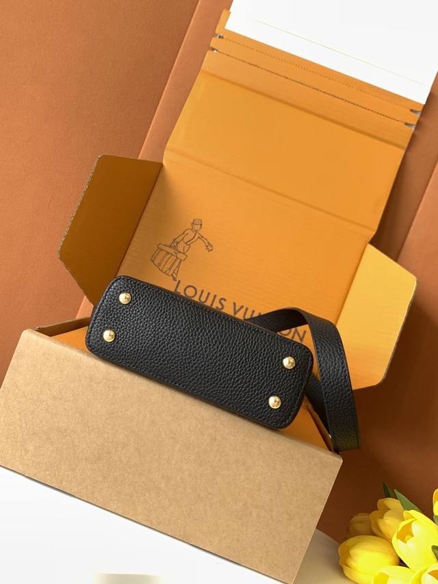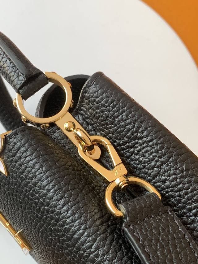 Extra-grade steel M11341 black and gold. This Capucines mini handbag, from the Flower Crown collection, features a sophisticated design infused with shell-like Monogram flowers and elegant hardware. The interior compartments house multiple pockets, and the detachable shoulder strap allows for versatile carrying options. 21 x 13.6 x 8 cm (length x height x width): Taurillon cowhide leather (