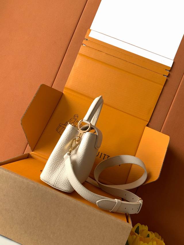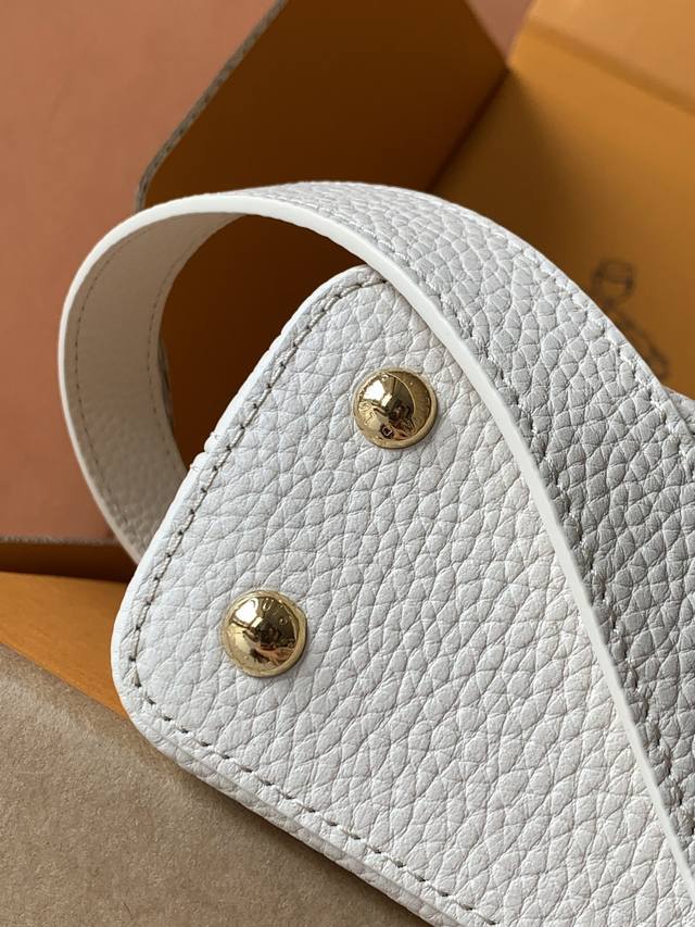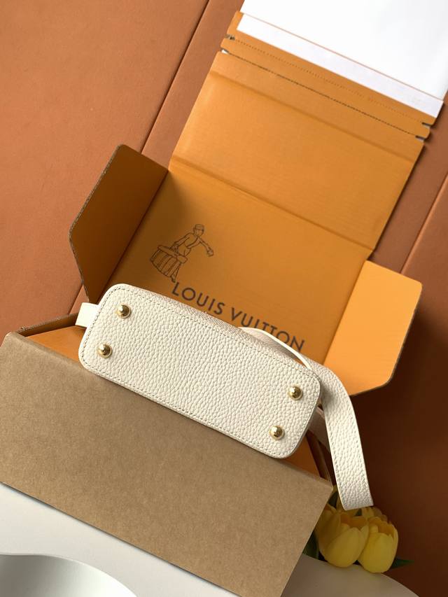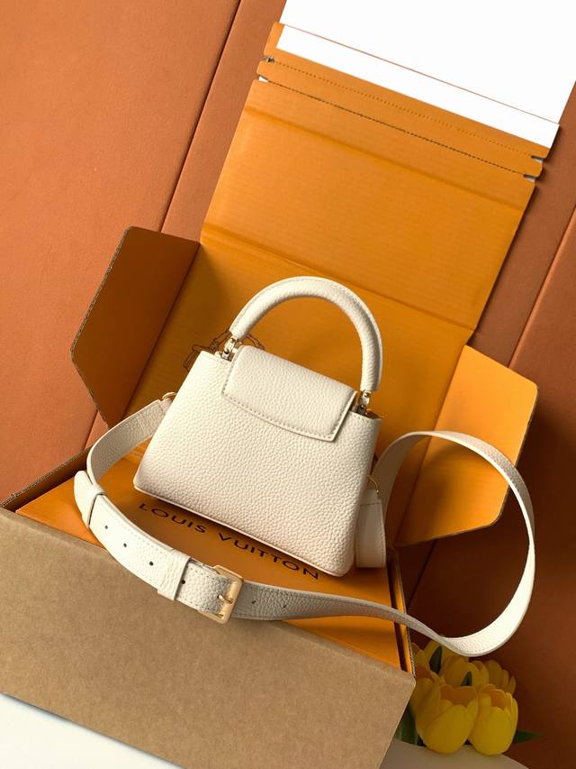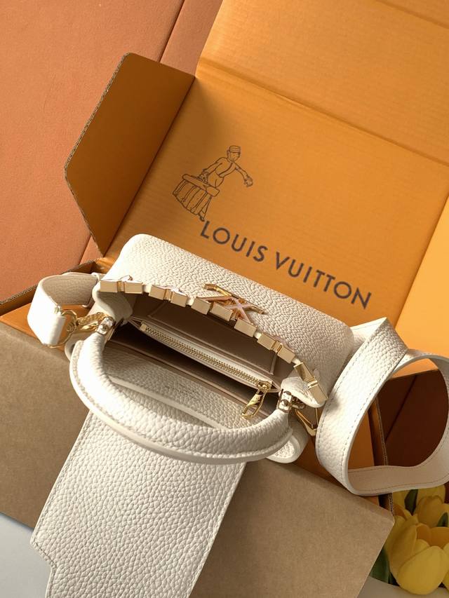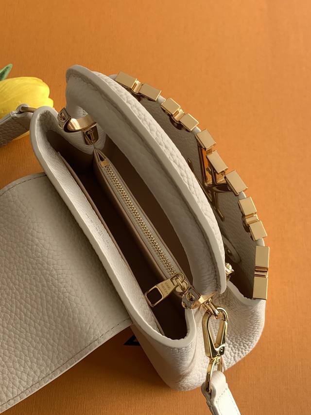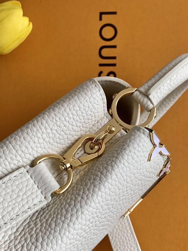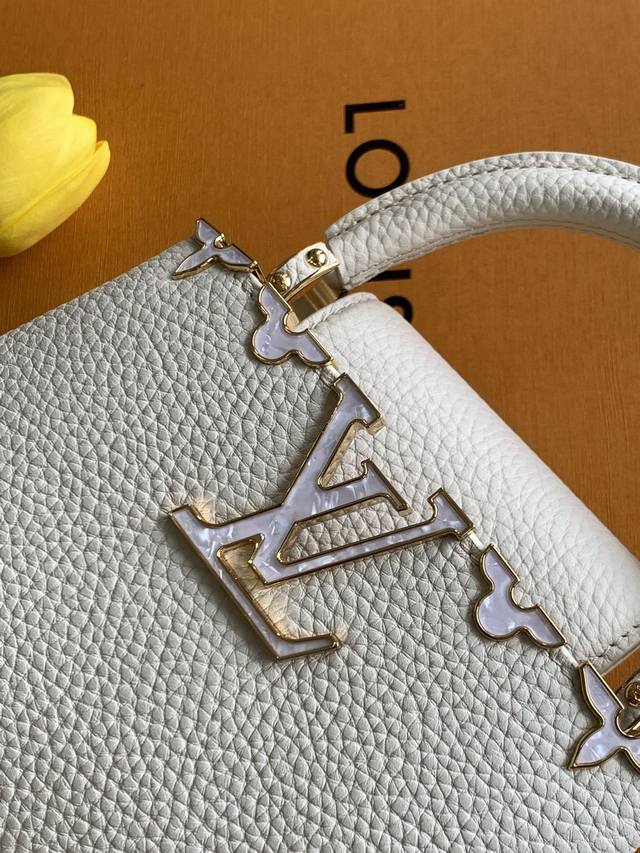 Extra-grade steel M11341 pearl white gold. This Capucines mini handbag, from the Flower Crown collection, features a sophisticated design infused with shell-like Monogram flowers and elegant hardware. The interior compartments house multiple pockets, and the detachable shoulder strap allows for versatile carrying options. 21 x 13.6 x 8 cm (length x height x width): Taurillon cowhide leather (