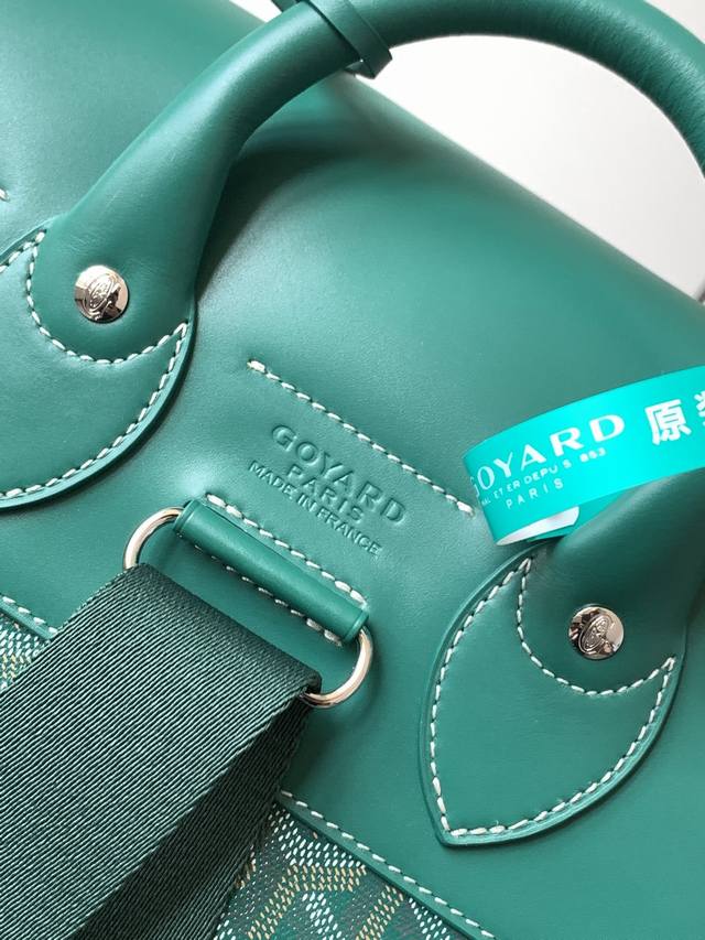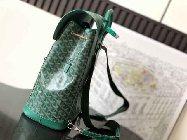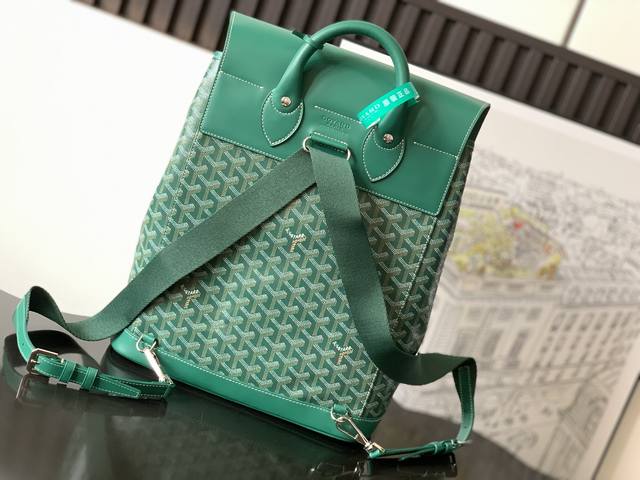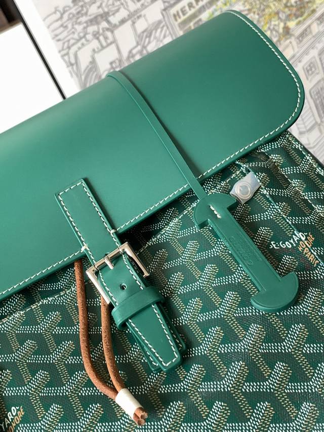 Factory price, highest edition, original leather, top-grade original single, with full counter packaging. This green Goyard Alpin backpack features an adjustable shoulder strap and a retractable key ring, allowing for different carry styles. Despite its multiple internal and external pockets, it remains lightweight and compact, making it highly practical.