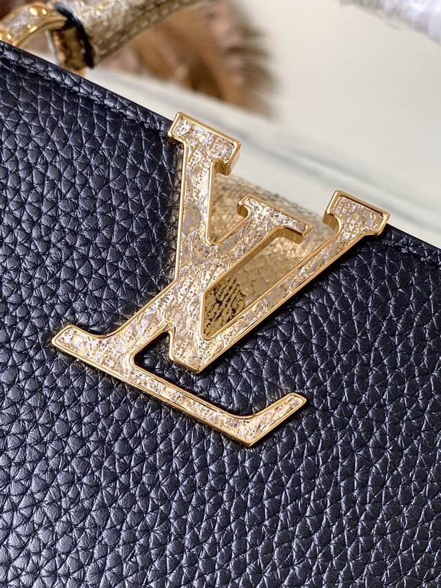 Factory Price p Duty-Free Import Version M89369 Black with Gold Snake Design. This Capucines bag has been redesigned with exotic python skin embellishments, showcasing its unique charm day or night. Made of Taurillon leather, it comes in various colors and features contrasting snakeskin handles and a key ring. The key ring hangs from a Monogram-patterned chain. This bag can be worn with either an interior or exterior flap, and can be carried crossbody, over the shoulder, or by hand. Size: 27 * 18 * 9 cm.