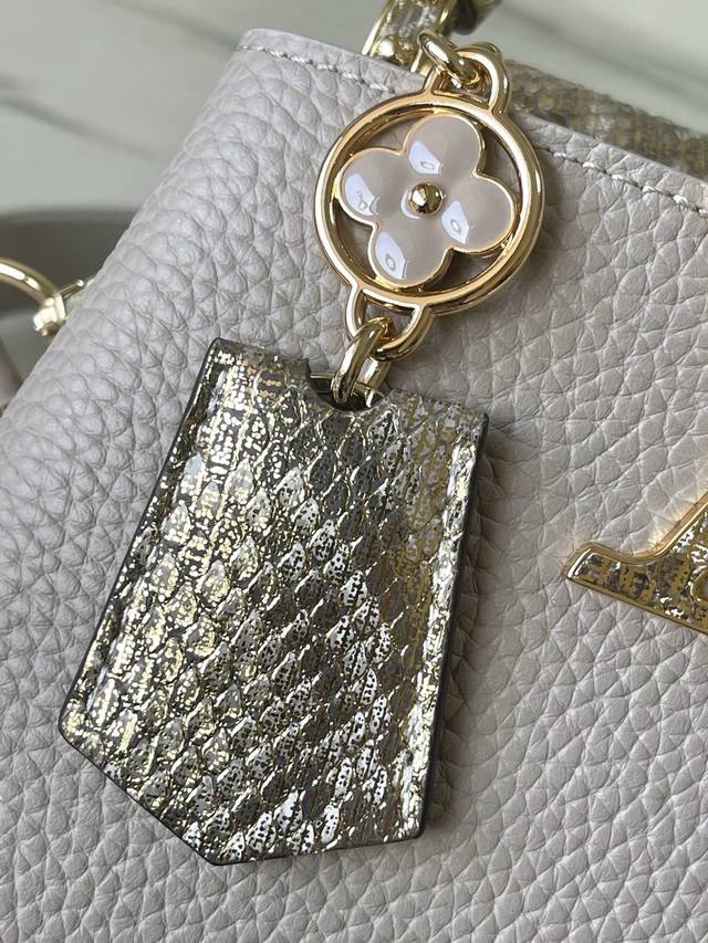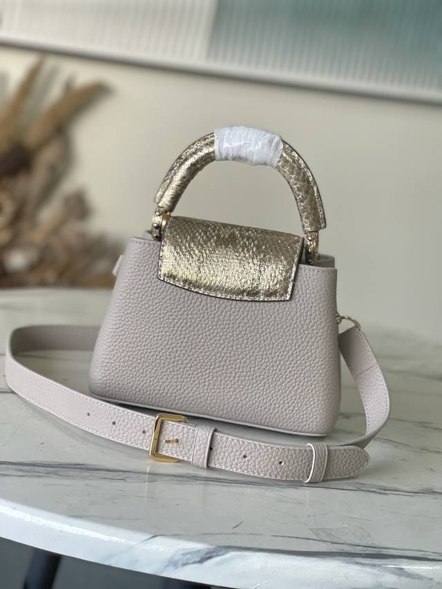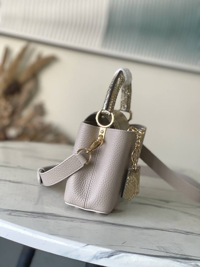 Factory Price p Duty-Free Import Version M89369 Light Brown with Gold Snake Design (Small). This Capucines bag has been redesigned with exotic python skin embellishments, showcasing its unique charm day or night. Made of Taurillon leather, it comes in various colors and features contrasting snakeskin handles and a key ring. The key ring hangs from a Monogram-patterned chain. This bag can be worn with either an interior or exterior flap, and can be carried crossbody, over the shoulder, or by hand. Size: 21 * 14 * 8 cm.