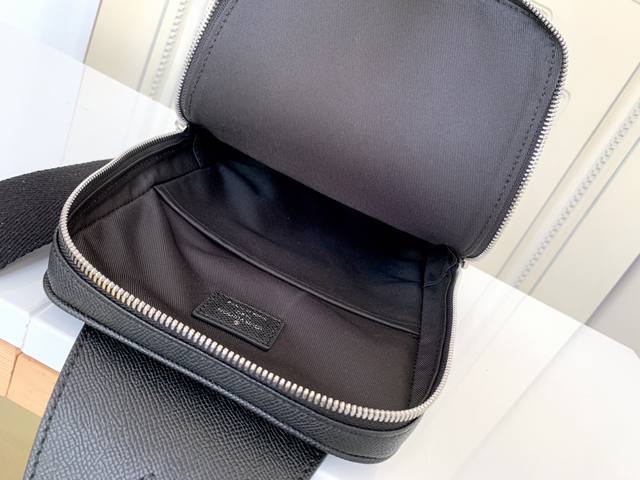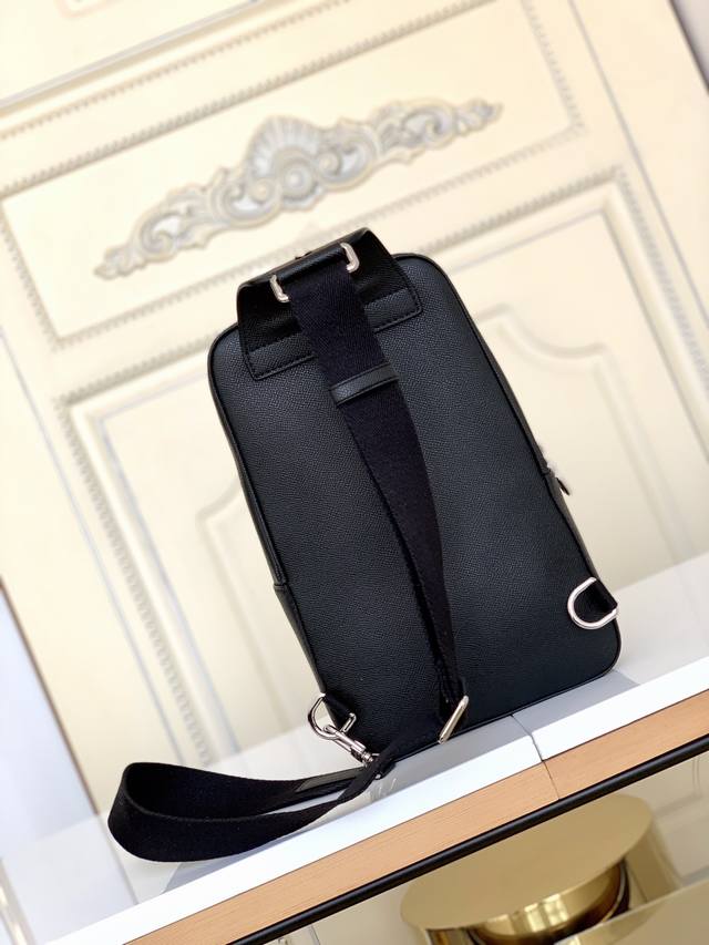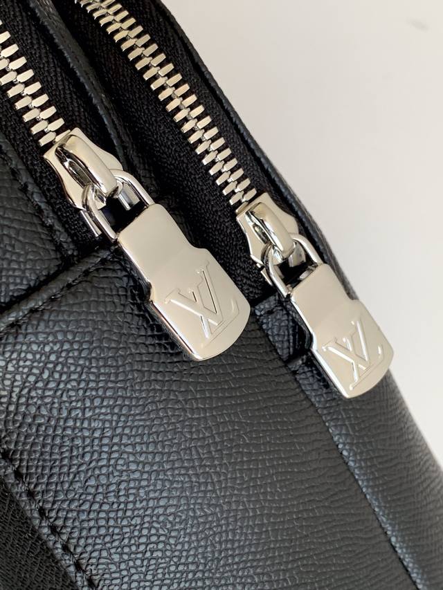 M30443 Avenue Shoulder Bag features signature Taga leather with lettering, a front zipper pocket, and interior patch pockets for added functionality, offering a stylish alternative to traditional backpacks. An adjustable shoulder strap and hook closure allow for left or right carry. Dimensions: 20.0 x 31.0 x 10.0 cm