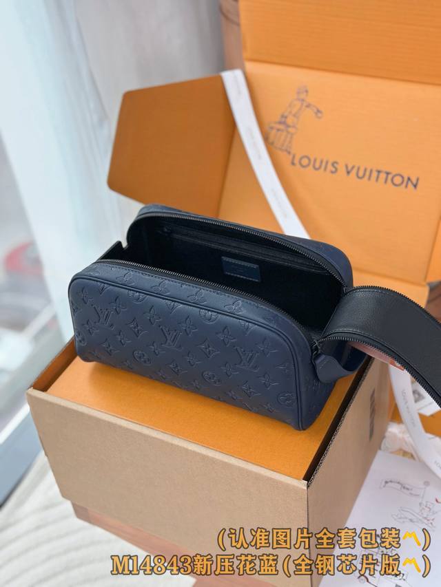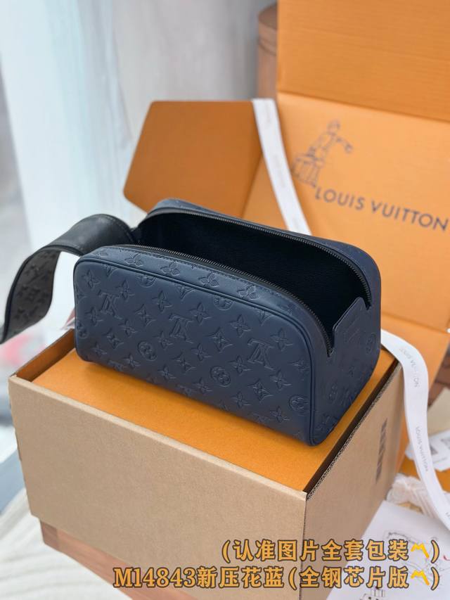 Factory Price p M14843 Blue Grade A All-Steel Version Personalized Customization, Variable Code Core! Dopp Toilet Bag. This Dopp toilette bag is spacious and made of the brand's classic Damier Graphite imported cowhide, adorned with leather trim. The design is modern, stylish, and exudes a masculine vibe. It features a double zipper closure for easy access to toiletries and beauty products. The toilette bag also has a wide handle for comfortable carrying and easy attachment to bathroom hooks. Dimensions: 28 x 15 x 16.5 cm (Length x Height x Width).