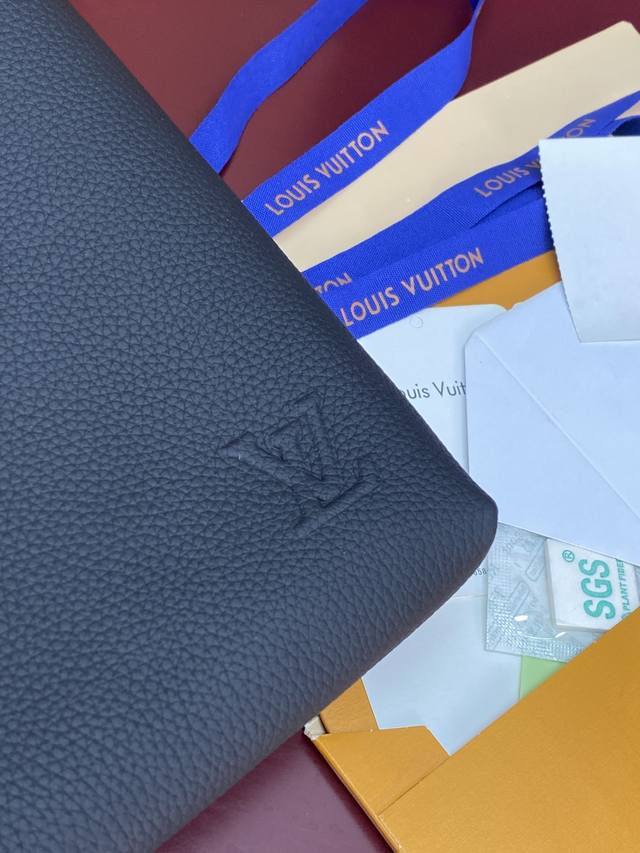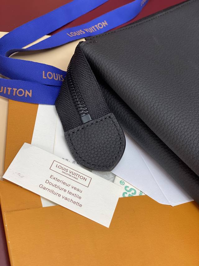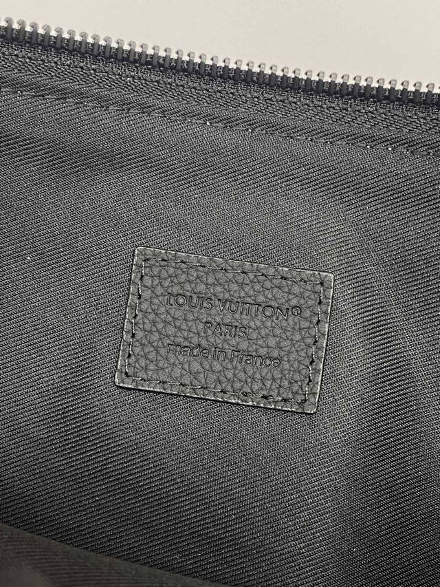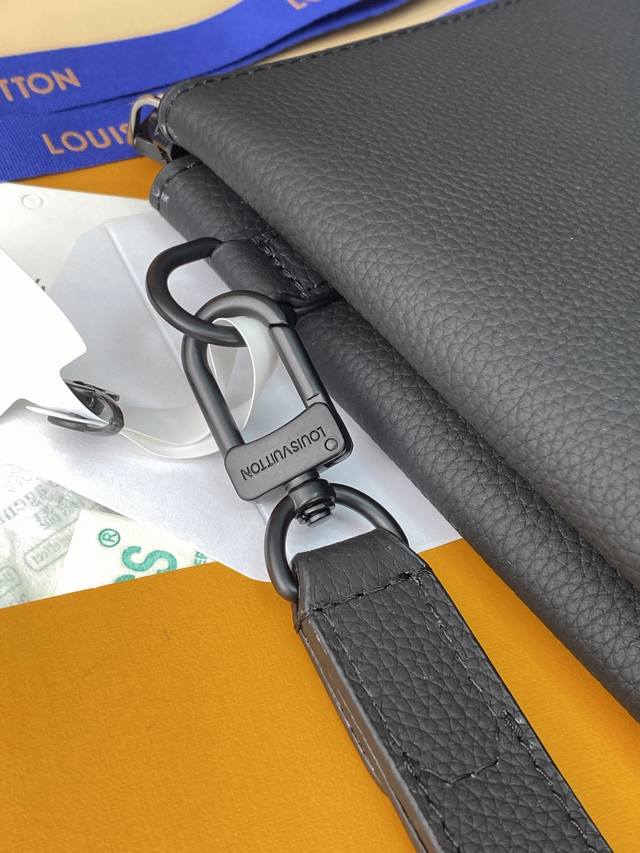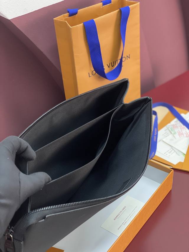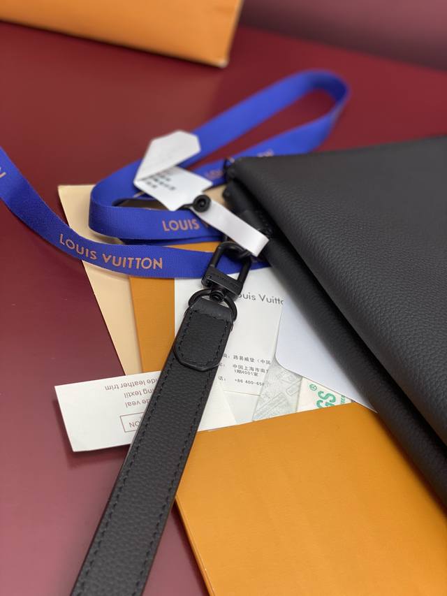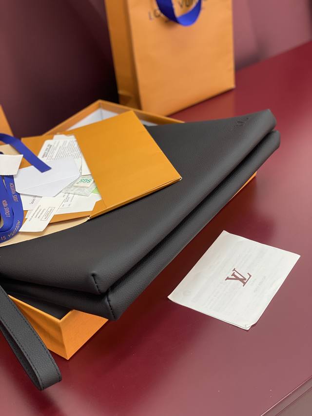 Factory Price p M25943 Black! Made of top-grain cowhide, this Duo pouch clutch features three separate interior compartments inspired by laptop bags, setting a new tone. This model has two laptop trays and a padded tray in the middle, perfect for chargers, smartphones, or mice. The smooth calfskin not only gives the bag a lightweight look but also protects the contents. A detachable wrist loop provides versatility. Dimensions: 35.5
