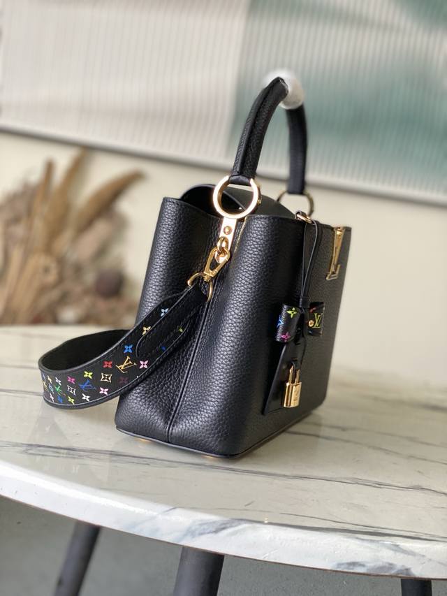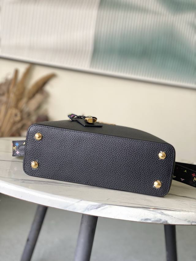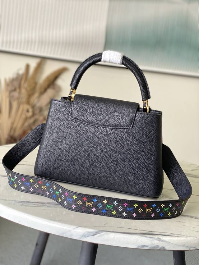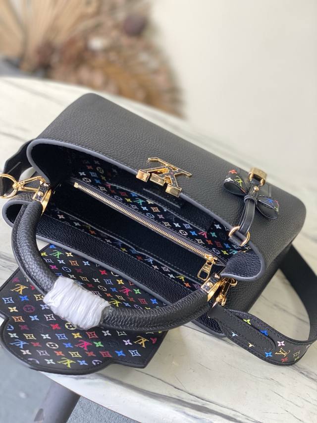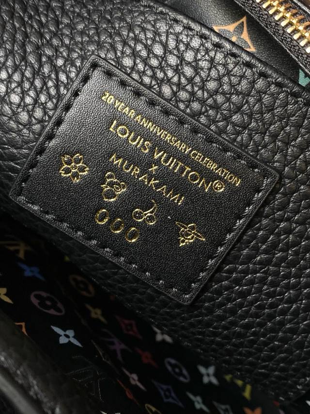 Factory Price p Premium Original Leather M28338 Black with Tricolor Charm Medium Size. Showcasing a light and breezy charm, this bag reinterprets the signature style of the season within the Murakami series. Featuring Haus's iconic Capsing tote in Torion leather, the bag boasts a detachable Monogram flower charm adorning the shoulder strap and lining, adding vibrant touches with its multicolor Monogram pattern. Size: 31.5 * 20 * 11 cm.