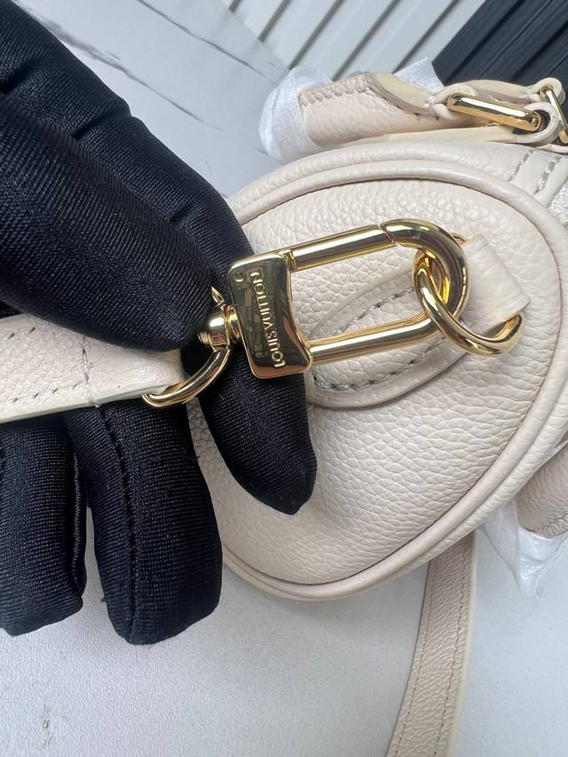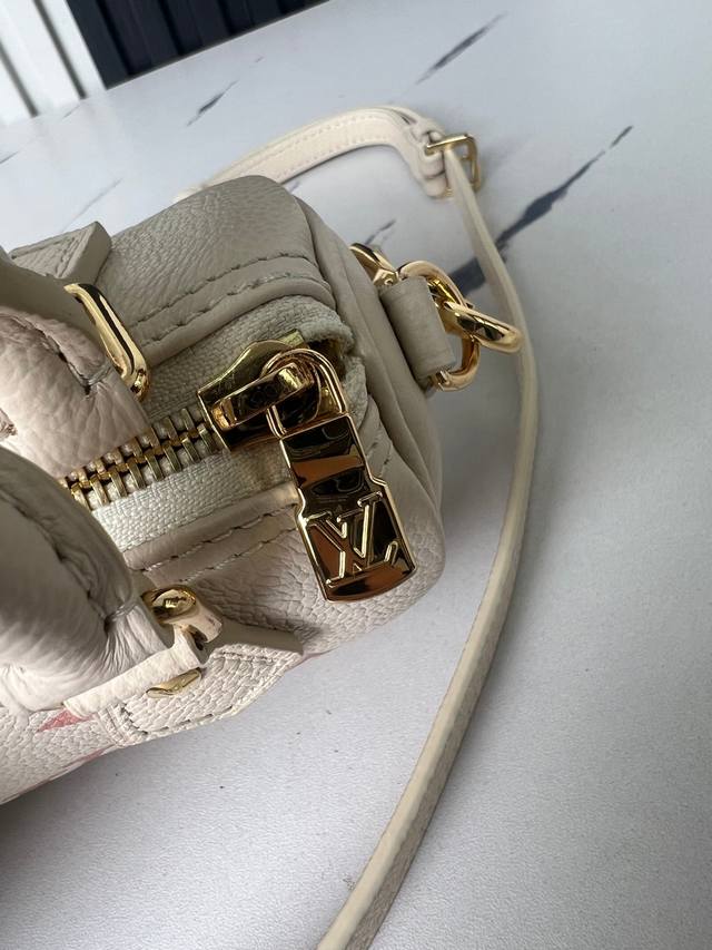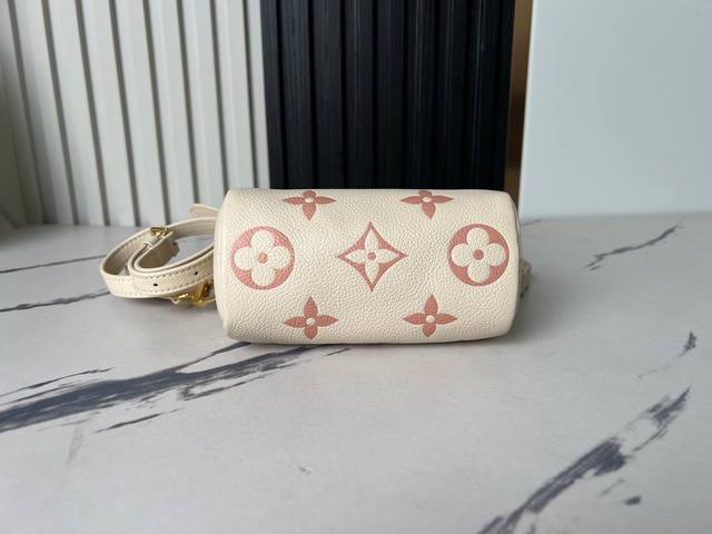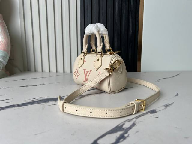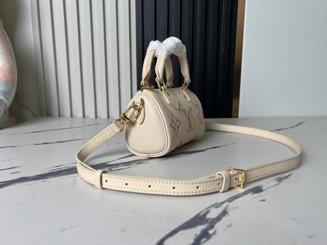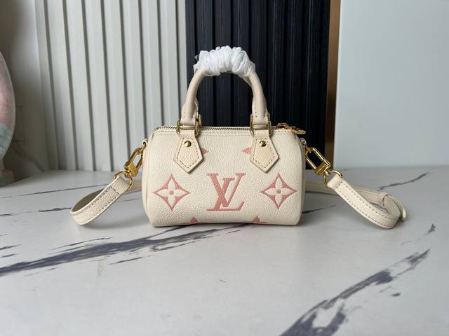 Factory Price (P) Top-Quality Original Home Photo M81913 Beige Printed Pink Nano Speedy Handbag. This miniature remake of the classic Speedy handbag features Monogram Empreinte soft grain leather, with a vibrant color accentuating the Monogram embossing. A zipper ensures secure closure, while a detachable and adjustable shoulder strap allows for versatile styling. Dimensions: 16.0 x 10.0 x 7.5 cm (L x H x W) (