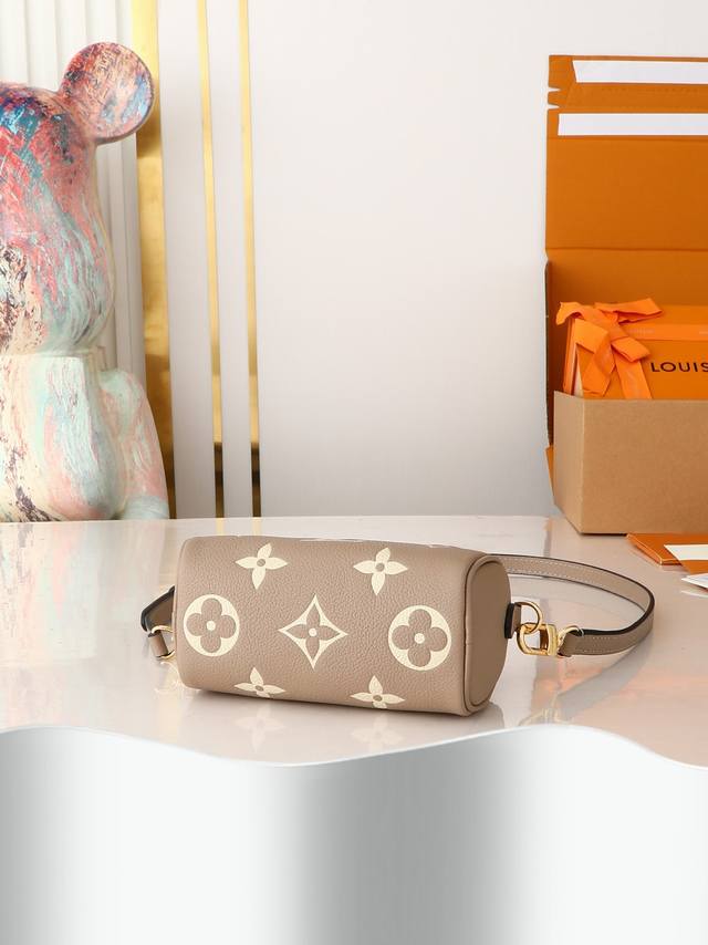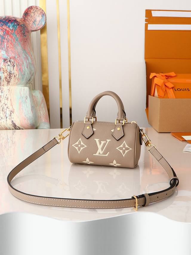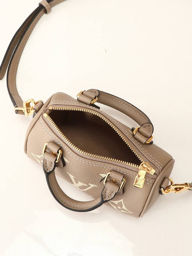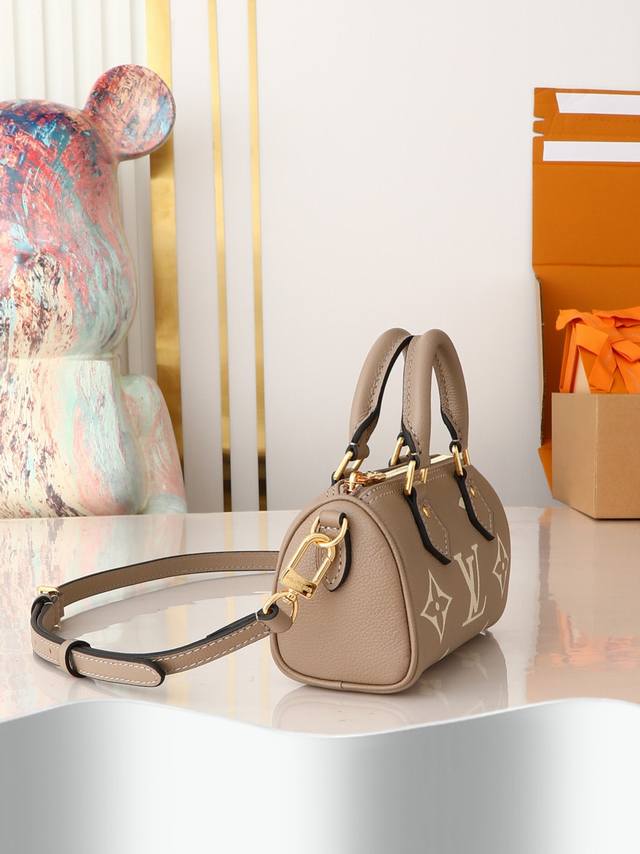 Factory Price (p) Top-Quality Original Home Photo M82890 Grey Silkscreen Nano Speedy Handbag. This miniature rendition of the classic Speedy handbag features Monogram Empreinte soft grain leather, with vibrant colors highlighting the Monogram embossing. A zipper ensures secure closure, while a detachable and adjustable shoulder strap allows for versatile styling. Dimensions: 16.0 x 10.0 x 7.5 cm (L x H x W) (