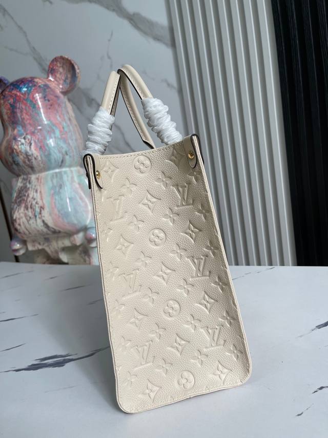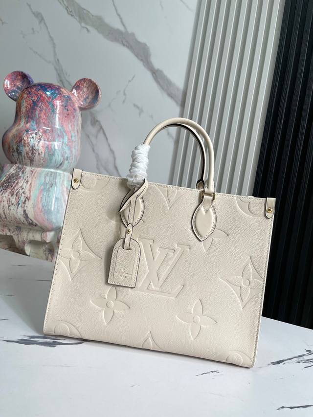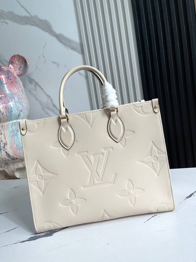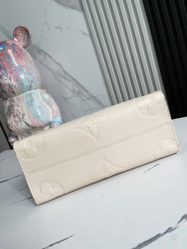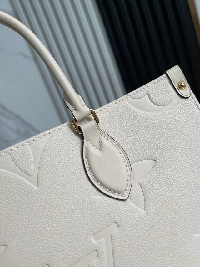 Factory Price (p) Top-Quality Original Single-Owner Photos (M46531, M45595) White Embossed. This Onthego Medium Handbag is crafted from Monogram Empreinte leather, featuring a grained texture that accentuates the Monogram embossing, adding a touch of elegance to the angular silhouette. A spacious microfiber interior accommodates a laptop, while rolled leather handles and a long shoulder strap allow for versatile carrying options. Dimensions: 35 x 27 x 14