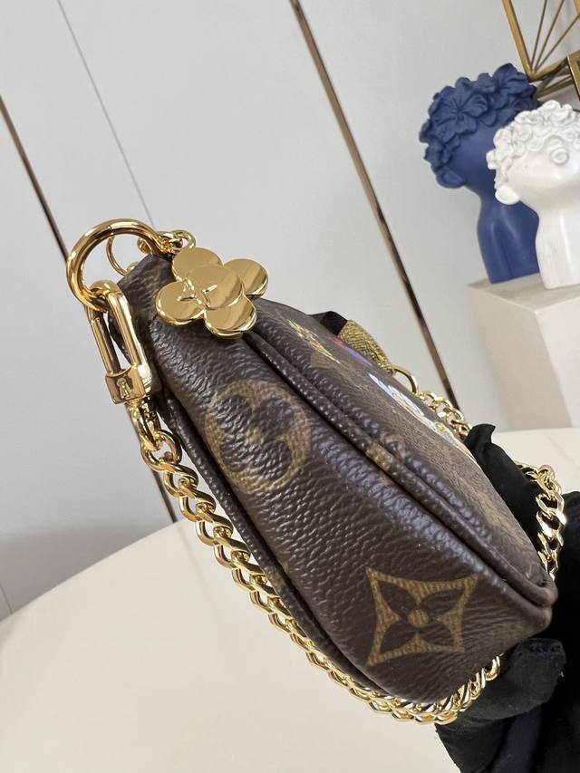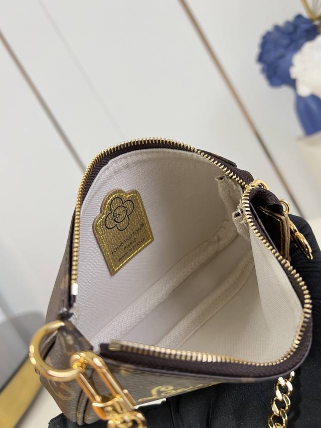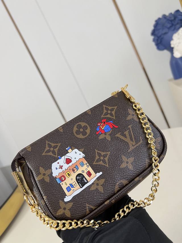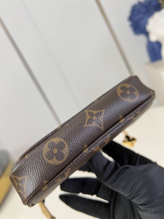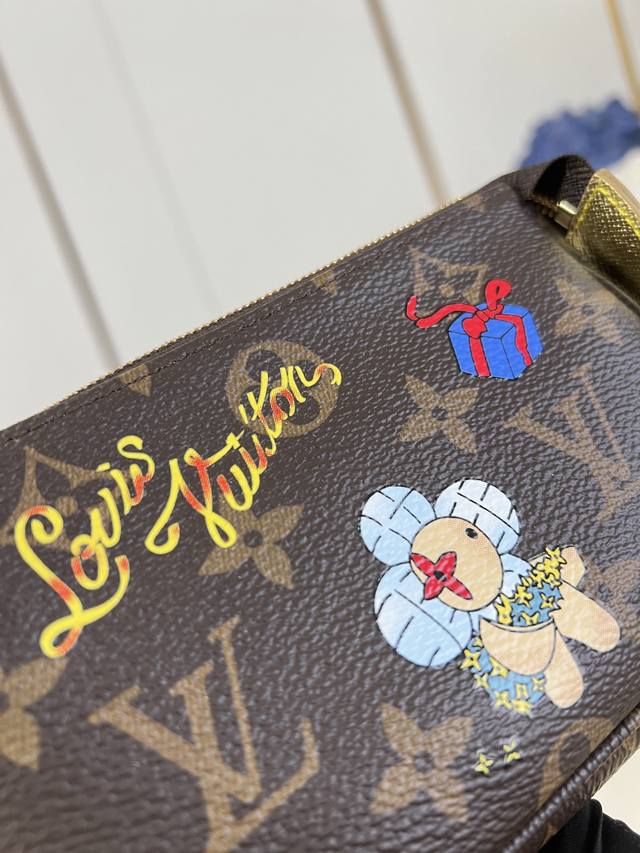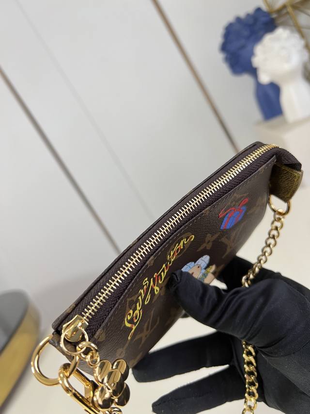Factory Price p Top-Tier Original M15328 Vivienne's Winter Holiday Collection introduces this Mini Pochette Accessories clutch, adorned with a playful graphic of the brand's mascot. The bag is crafted from classic Monogram canvas with cowhide leather trim and features a chain and hook, allowing it to be attached to your favorite handbag or carried alone. The zipper pull, inspired by Vivienne, boasts an elegant and striking sheen. 10.5 x 4 x 15.5 cm (H x W x Length) DDD