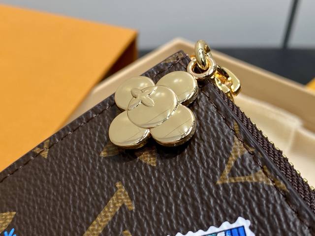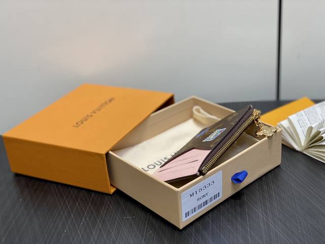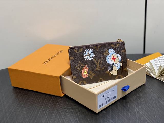 Factory Price p Top-Tier Original M15333 Silkscreen Christmas Style Card Holder/Wallet Romy Card Clip This Romy card clip presents a playful new look from the Vivenne Wintery Travel series. Made of Monogram canvas with a leather lining, the zipper pull features the brand's mascot, Vivienne. It includes card slots, a zippered coin pocket, and a bill pocket. 8 x 0.8 x 12 cm (H x W x Length)