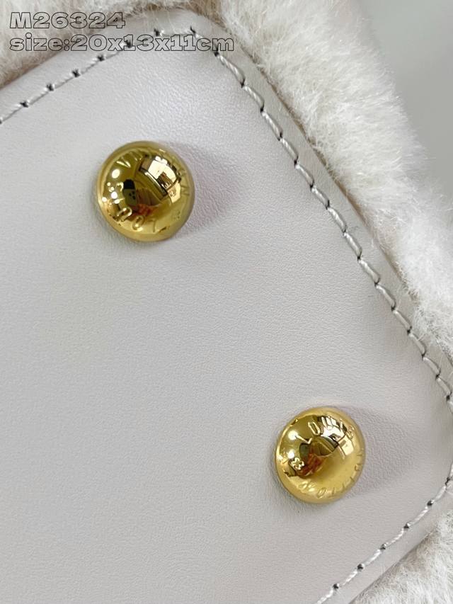 Factory Price p Top-Tier Original M26324 This Capusnow bag is playful and injects a fashionable touch into the Cozygram series, making it suitable for both ski trips and everyday looks. This trendsetting special edition bag is crafted from Cream-colored sheepskin and features a detachable charm adorned with two plush pom-poms, showcasing refined taste. Its compact design offers just the right amount of space for everyday essentials. The flap can be worn inside or out, while the silver and gold-tone metal accents add an elegant touch to the overall design. 20 x 13 x 11 cm Length x Height x Width DDD