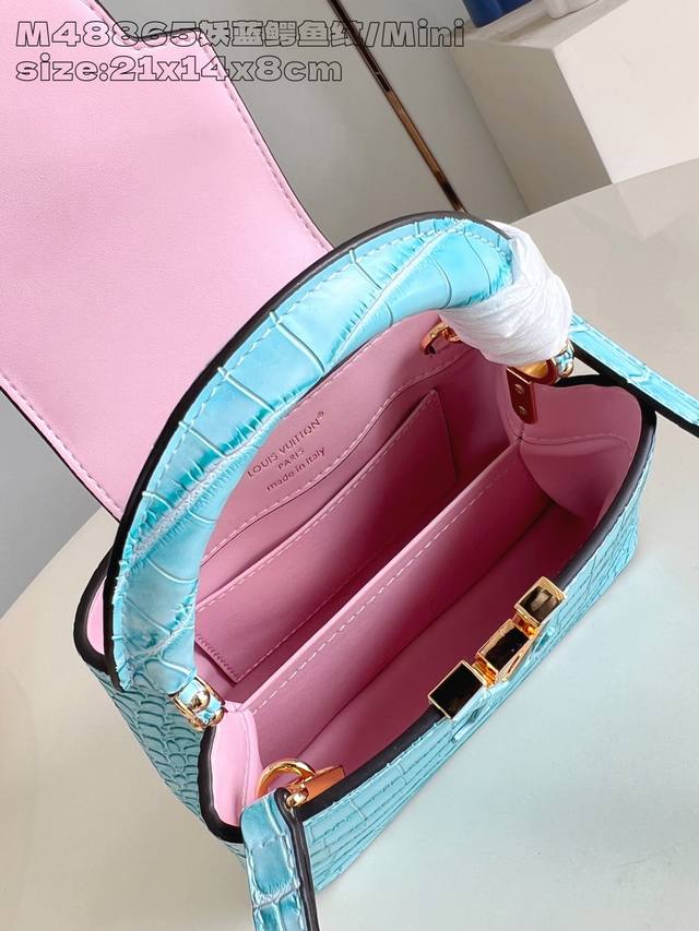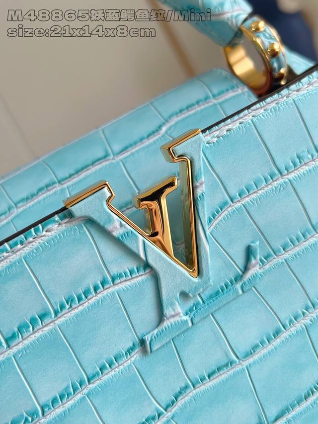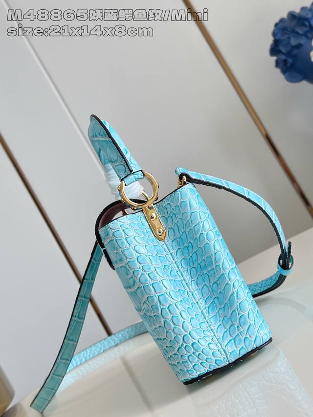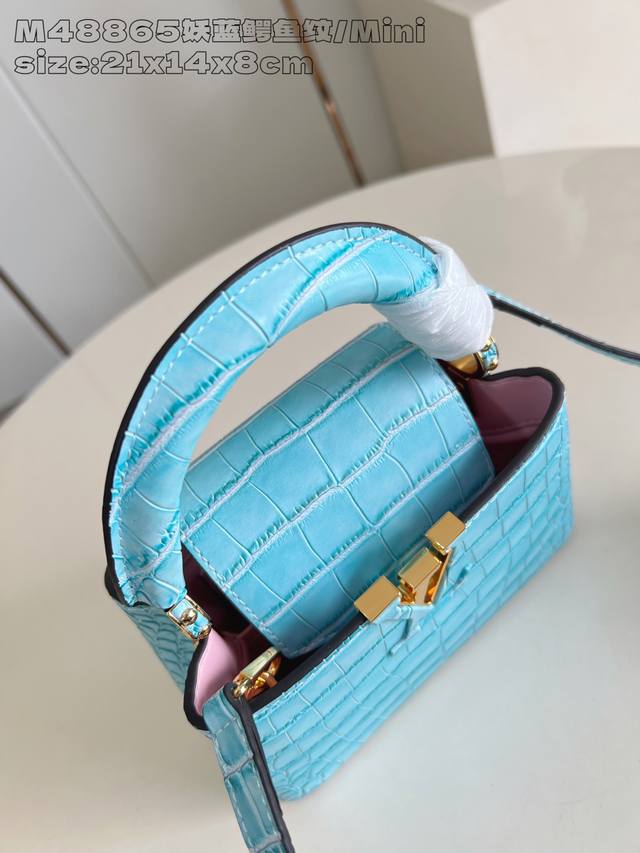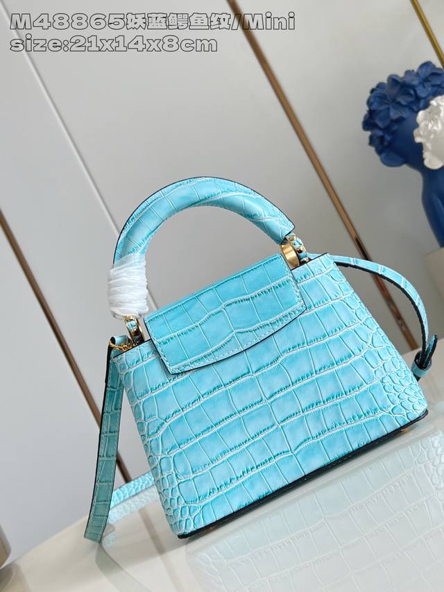 Factory Price p Top-Tier Original M48865 Enchanting Blue Crocodile Mini Capucines Handbag. Made of crocodile leather with a polished finish, this mini handbag is dazzling and captivating. Luxurious goatskin lining and shimmering metal hardware complete the look. The unique Capucines flap can be tucked inside to display the logo or opened outwards. Size: 21 x 14 x 8 cm DDD