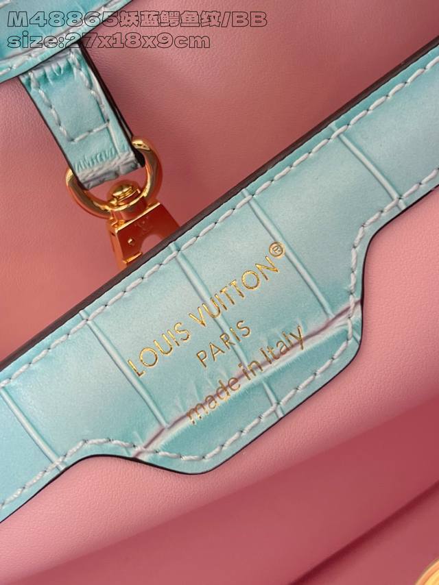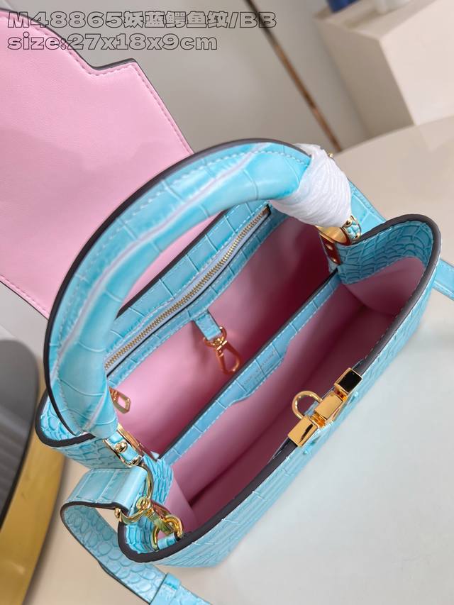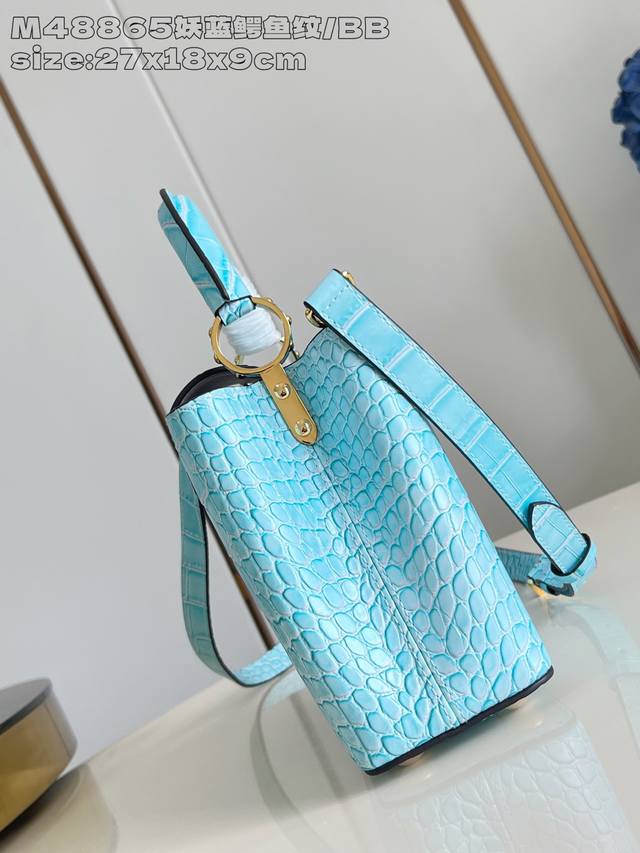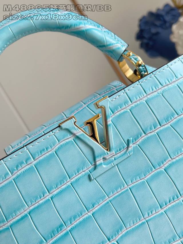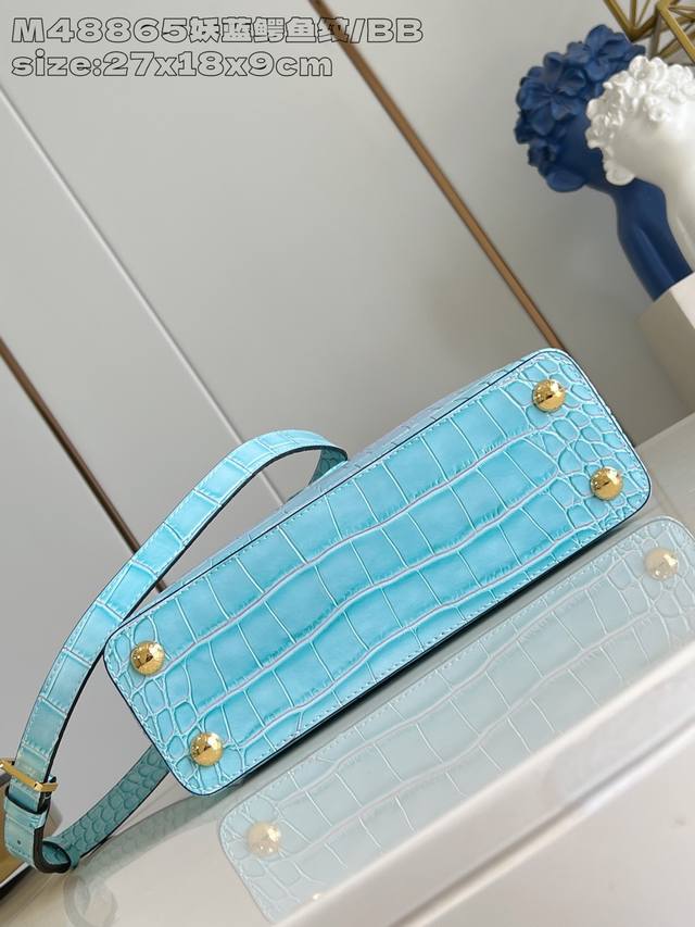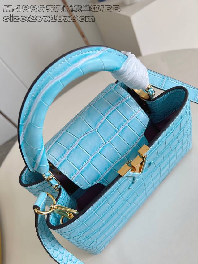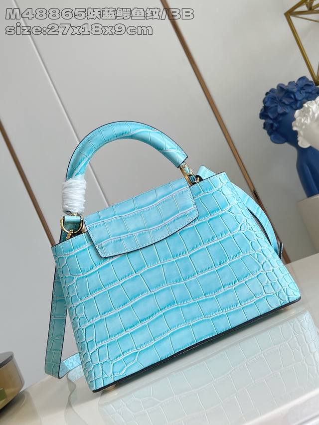 Factory Price p Top-tier original M48865 Enchanting Blue Crocodile Pattern Small Capucines BB Handbag. Made of crocodile leather with a polished finish, it shines dazzlingly. Luxurious goatskin lining and shimmering metal hardware. The unique Capucines flap can be tucked inside to display the monogram, or turned outwards. Size: 27X18X9Cm DDD