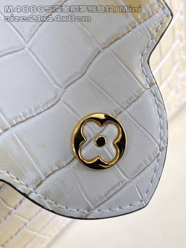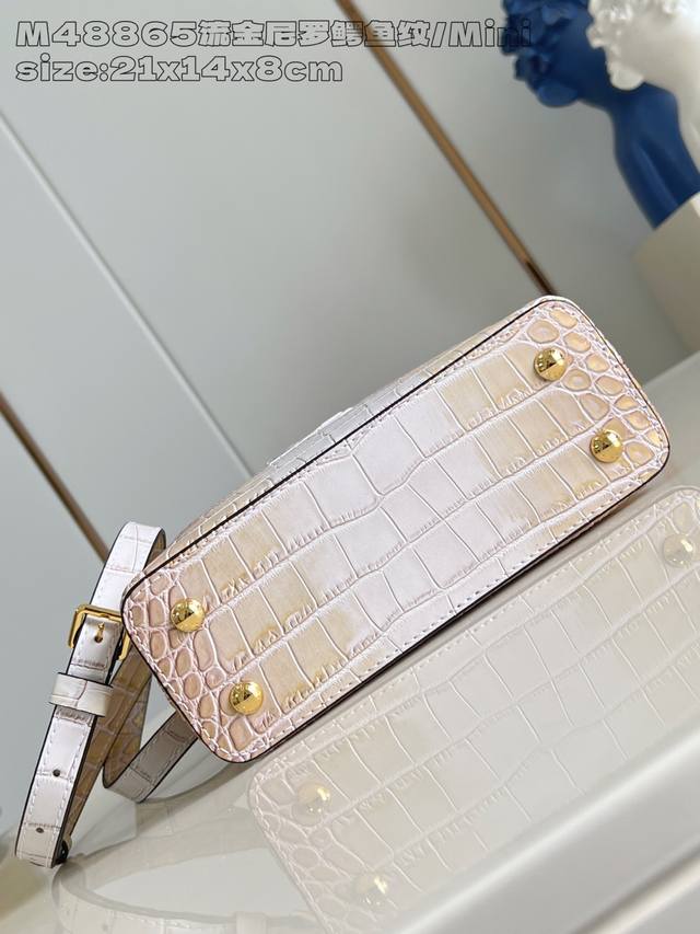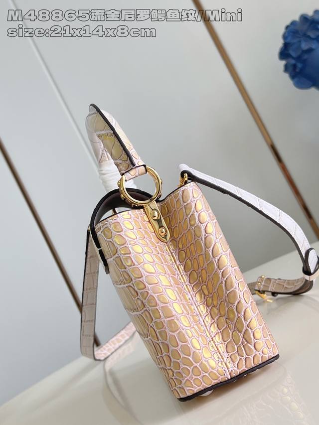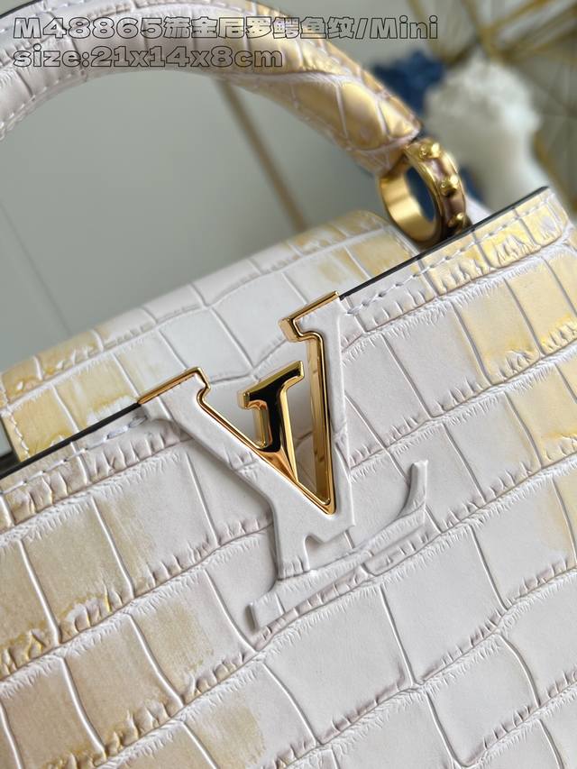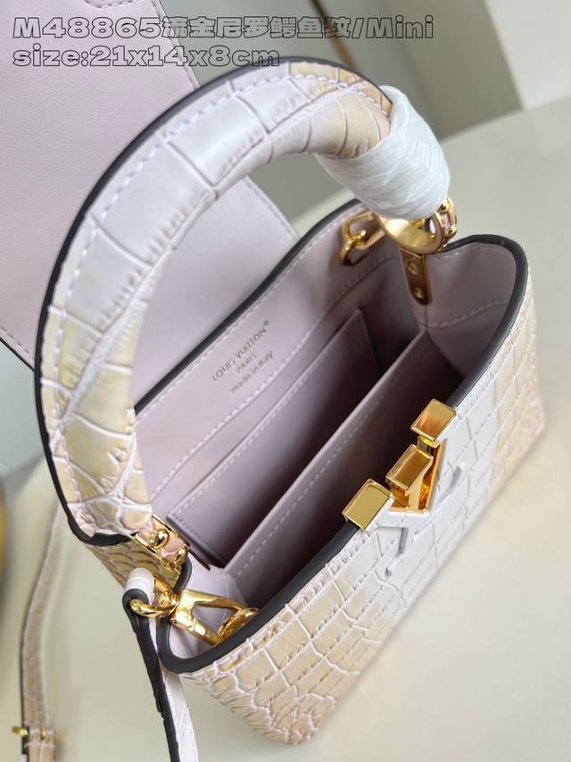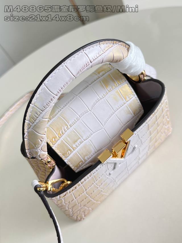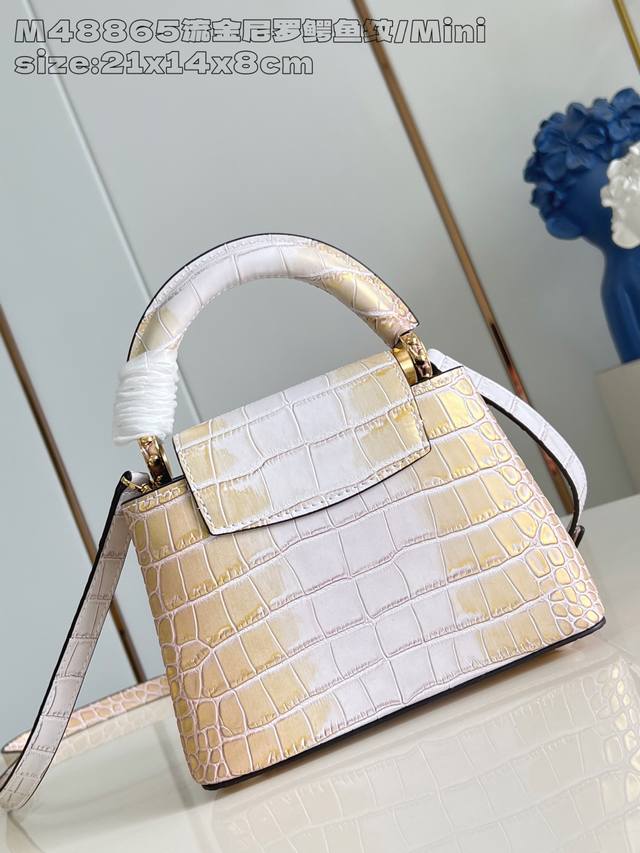 Factory Price p Top-tier original M48865 Gold-plated Nile Crocodile Mini Capucines Handbag. Made of crocodile leather with a polished finish, this mini handbag is dazzling and eye-catching. Luxurious goatskin lining and shimmering metal hardware complete the look. The unique Capucines flap can be tucked inside to display the logo or opened outwards. Size: 21 x 14 x 8 cm DDD