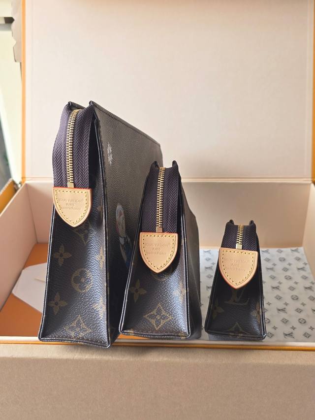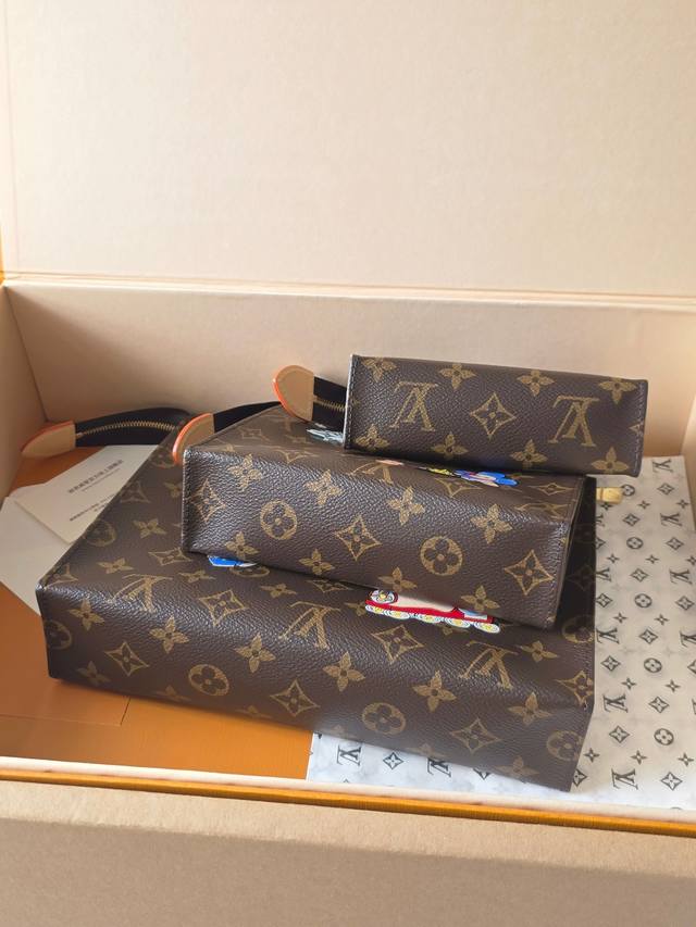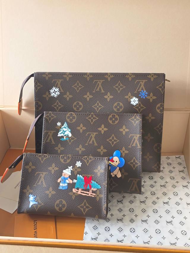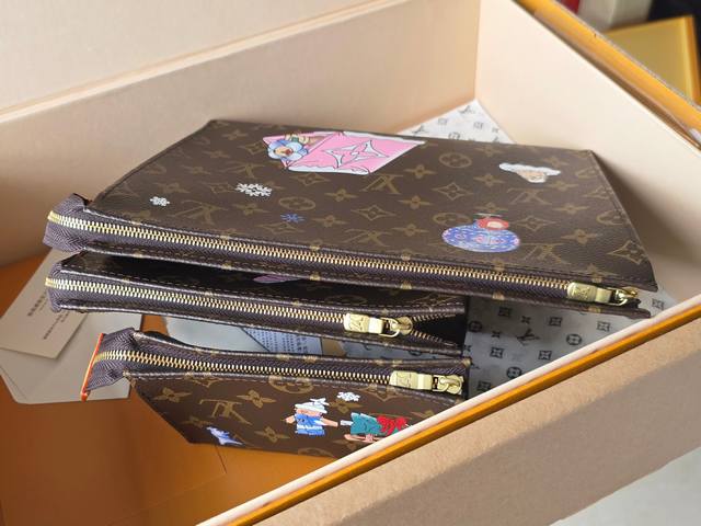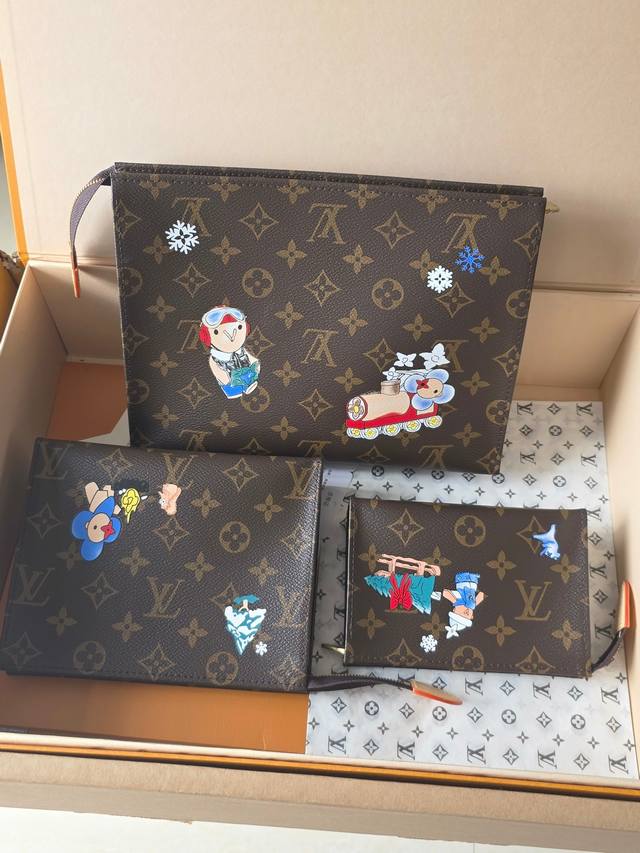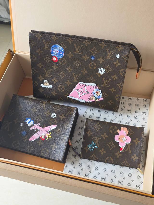 Factory Price. Top-quality original leather, top-grade original single item with complete boutique packaging. M15357 three-piece handbag set. Made with Monogram canvas, this three-piece small bag set is part of the "Trio Small Bag Series." It depicts the manor's mascot, "Vivienne," traveling by train and bicycle, enjoying hiking, and even encountering adorable winter animals in a hot air balloon ride