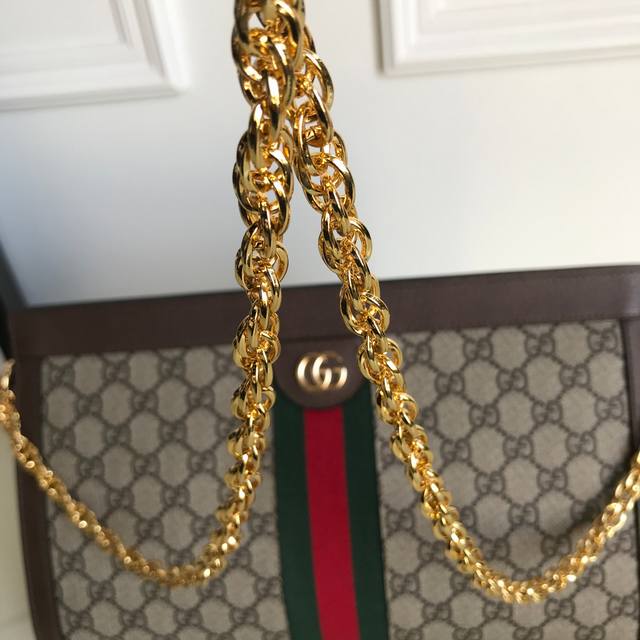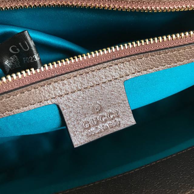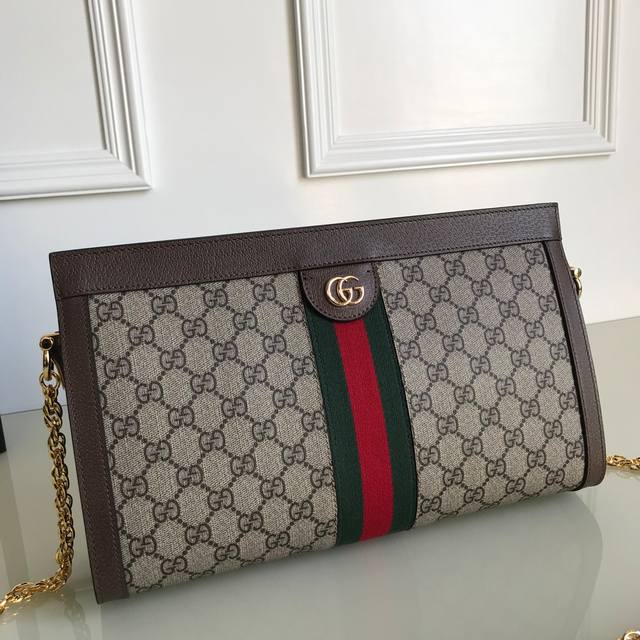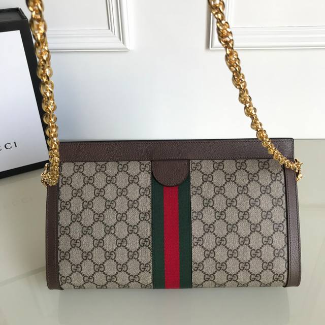 Genuine leather running large size G. 2018 Ophidia collection, featuring intarsia webbing stripe details, highlights the retro design. The structured shape features a secure magnetic closure, leather trim, and archival Double G hardware. Model: 503876, Dimensions: 32.5 x 20 x 10 cm.