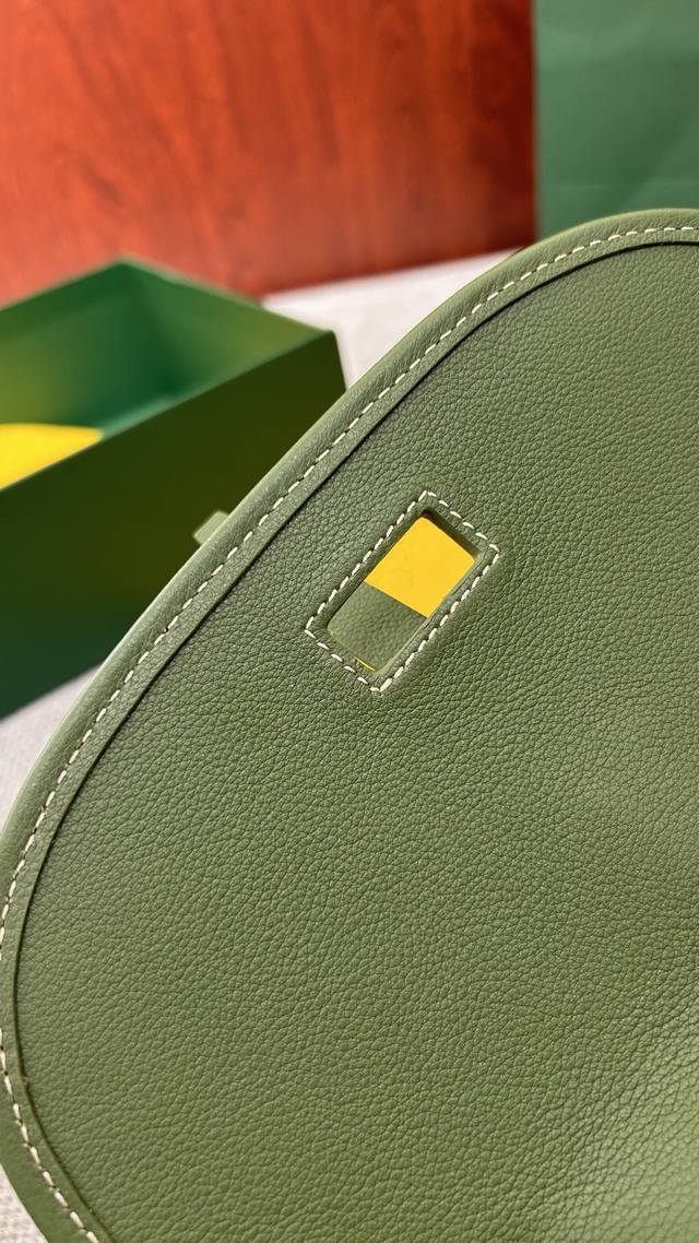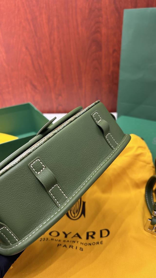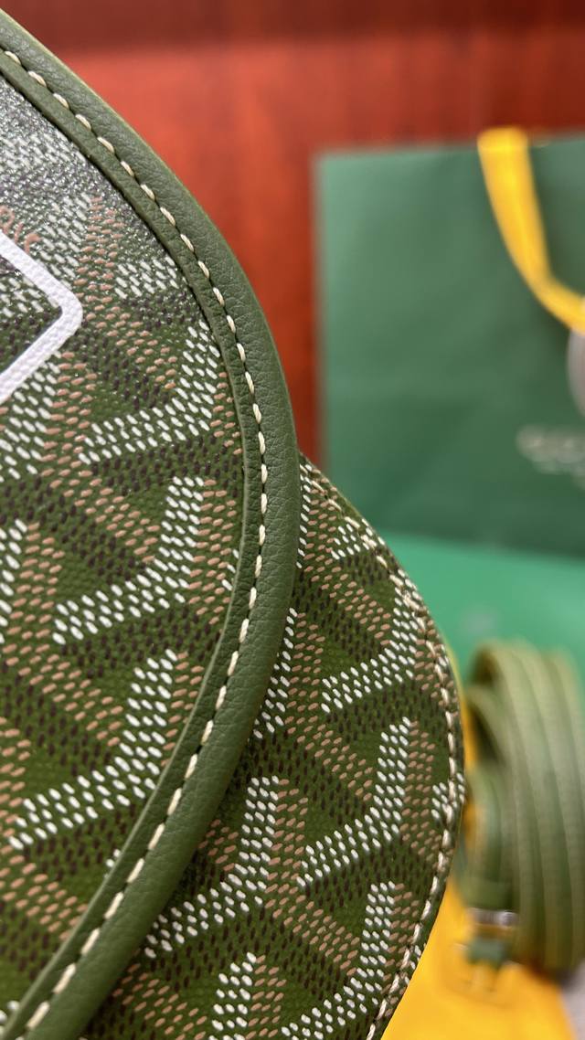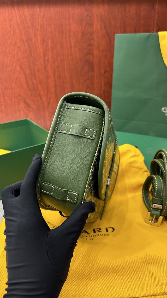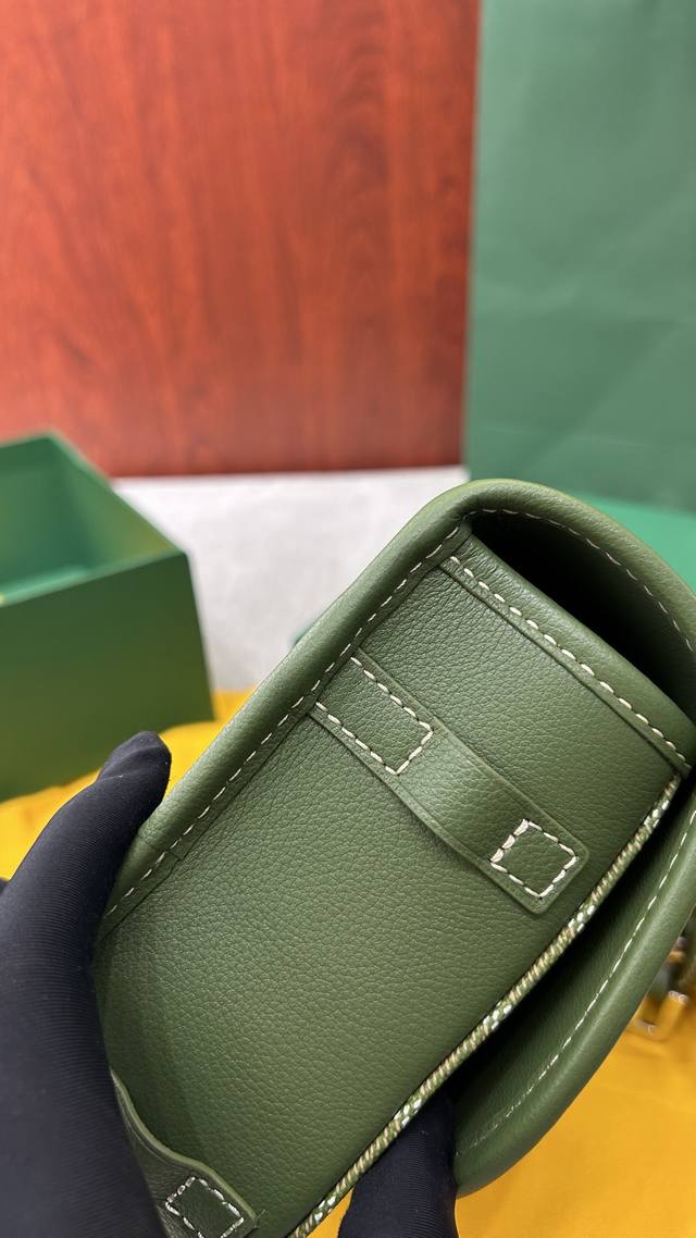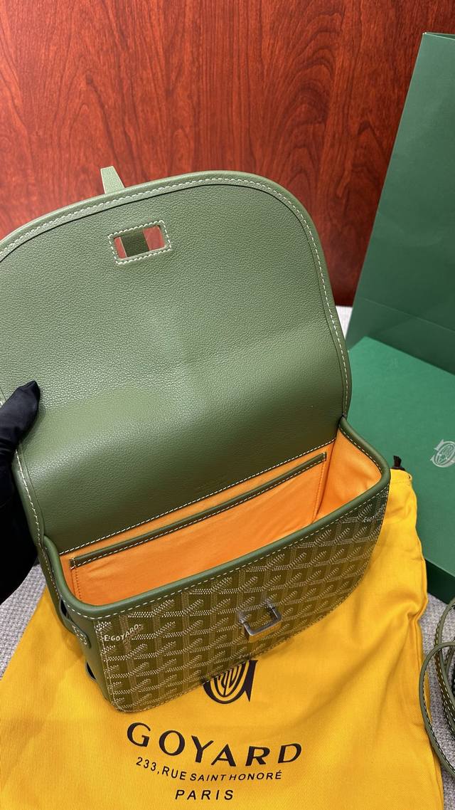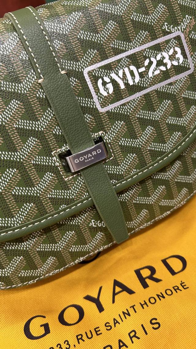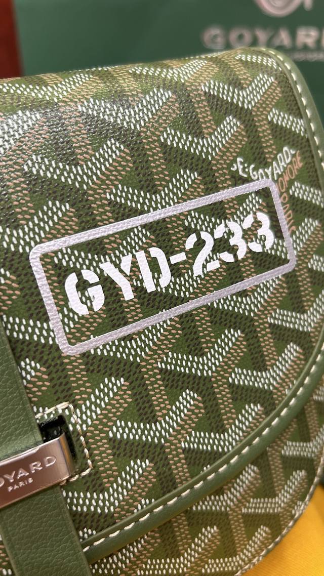 This 2025 limited edition Belved Re small bag is made of exclusive khaki green Goyardine canvas. The "Gyd-233" painted on the bag is inspired by the registration number on the trunk of an antique car, paying tribute to Goyard's art of travel and our historic store at 233 Saint-Honor 3rd Street. The Belved Size E small bag is lightweight and practical, with a crossbody