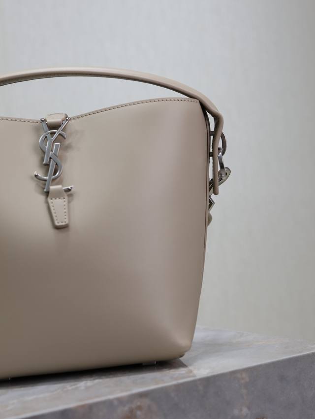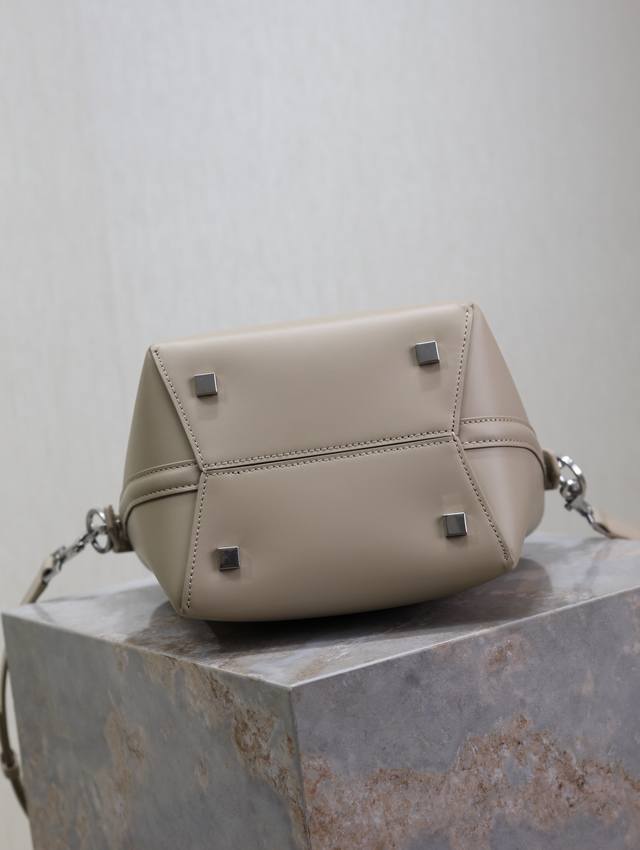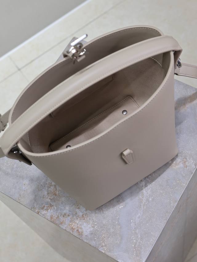 A stunning bucket bag with a top handle_A brand new bag design, crafted from Italian calfskin, with a simple, three-dimensional silhouette that looks stiff without being too harsh. The bag features metal feet at the bottom and a snap-on clasp with the classic metal logo, creating a unique, classic and elegant look that's both stylish and modern!