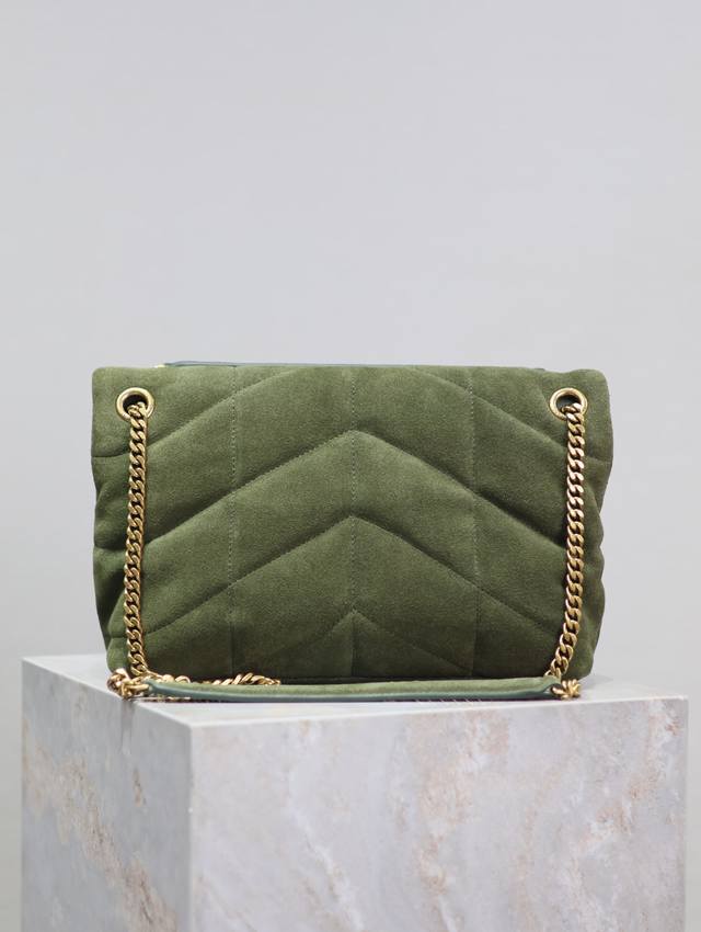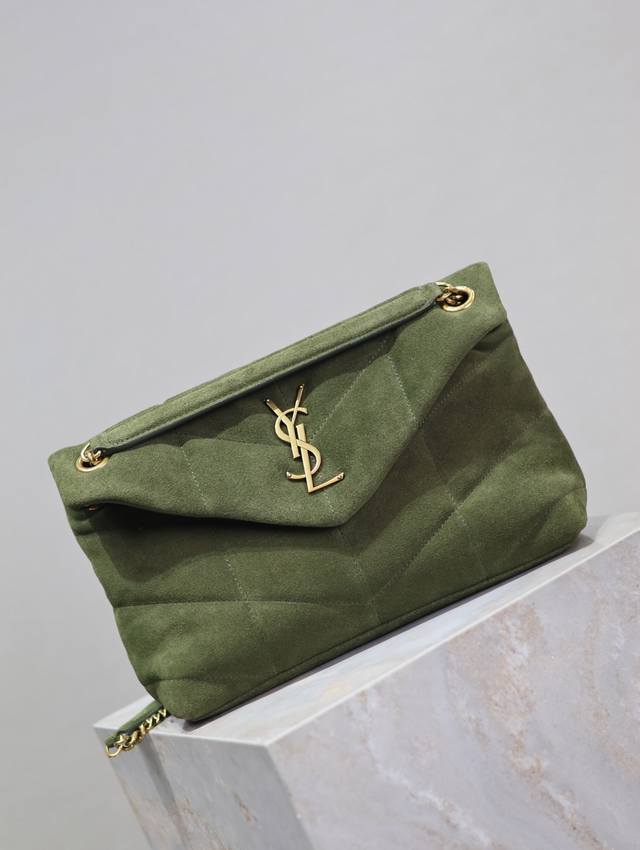 Green, frosted, gold-buckled Loulou Puffer bag. Made from 100% lambskin, this bag feels soft and delicate, like embracing a cloud. The classic Y logo, chain, and eyelet hardware are all made from distressed metal, creating a uniquely vintage feel.