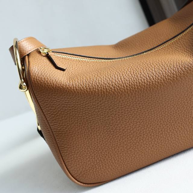 Half Horsebit Large Shoulder Bag, a refreshed version of one of the brand's most iconic elements, reinterpreted with a modern style. The collection cleverly blends a relaxed silhouette with the signature half-horsebit hardware, from which it derives its name. Interior: One open pocket, adjustable cowhide leather shoulder strap, style number 860787, brown leather, dimensions: Width 31.5 x Height 17 x Depth 12