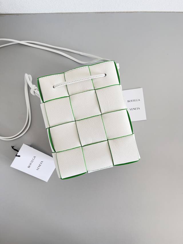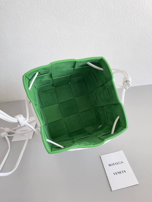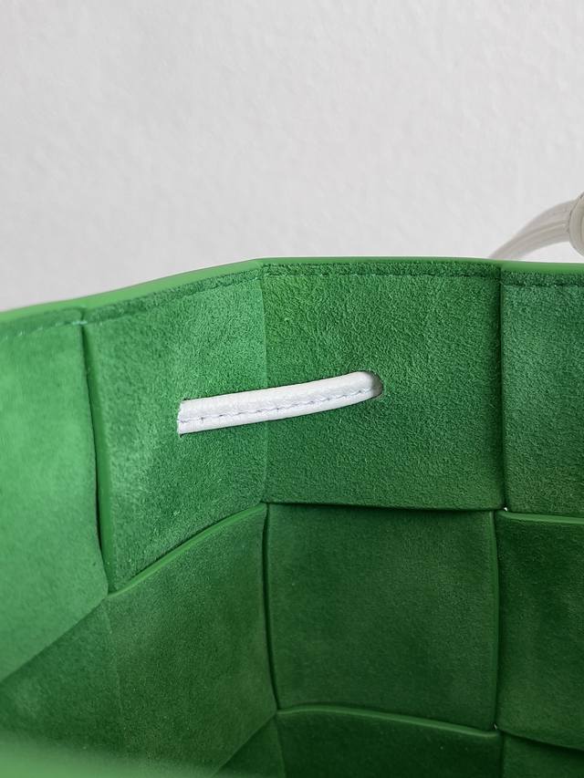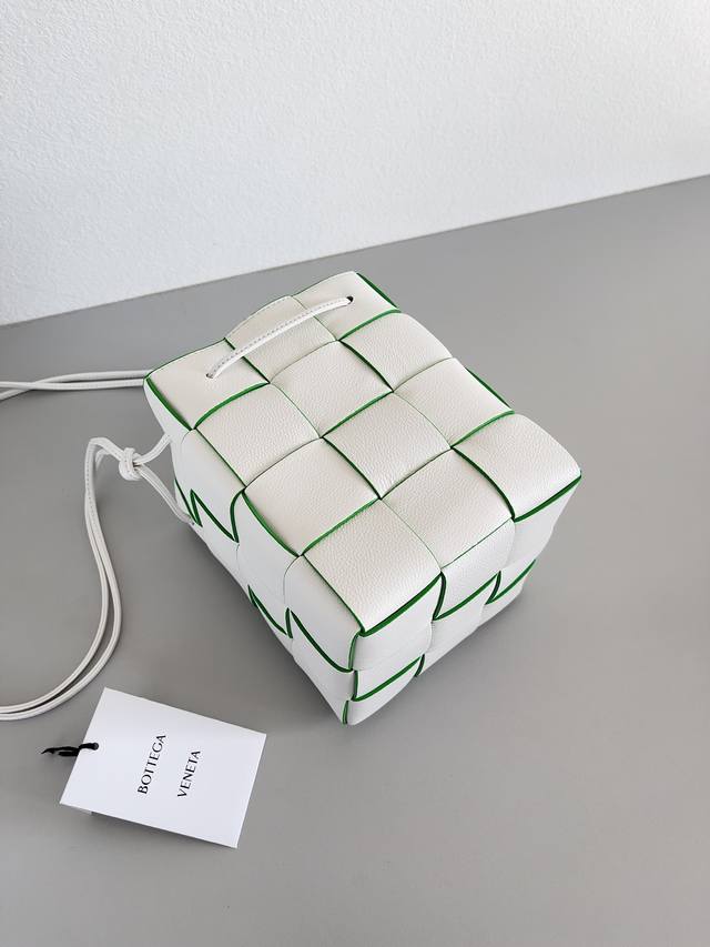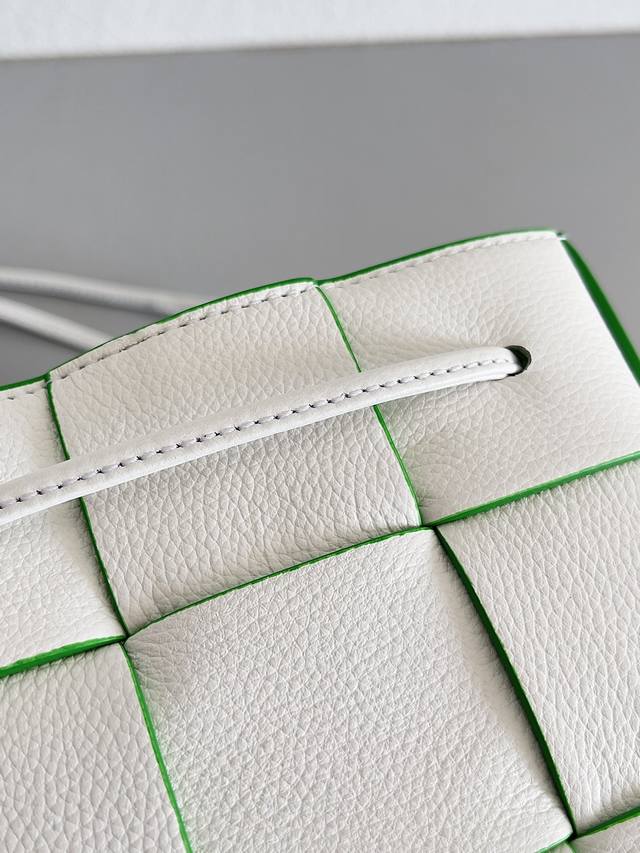 Hand-woven Large Bucket Bag DDD Bv's latest cutie, continuing Daniel Lee's minimalist style. The small size will poke out a little bit if you put your phone in it, but the large size is completely spacious and can hold anything. Made with a mold and purely hand-woven. DDD Style Number: 680218 DDD Size: 18*14*14Cm DDD Colors: Grainy White Parrot Green DDD