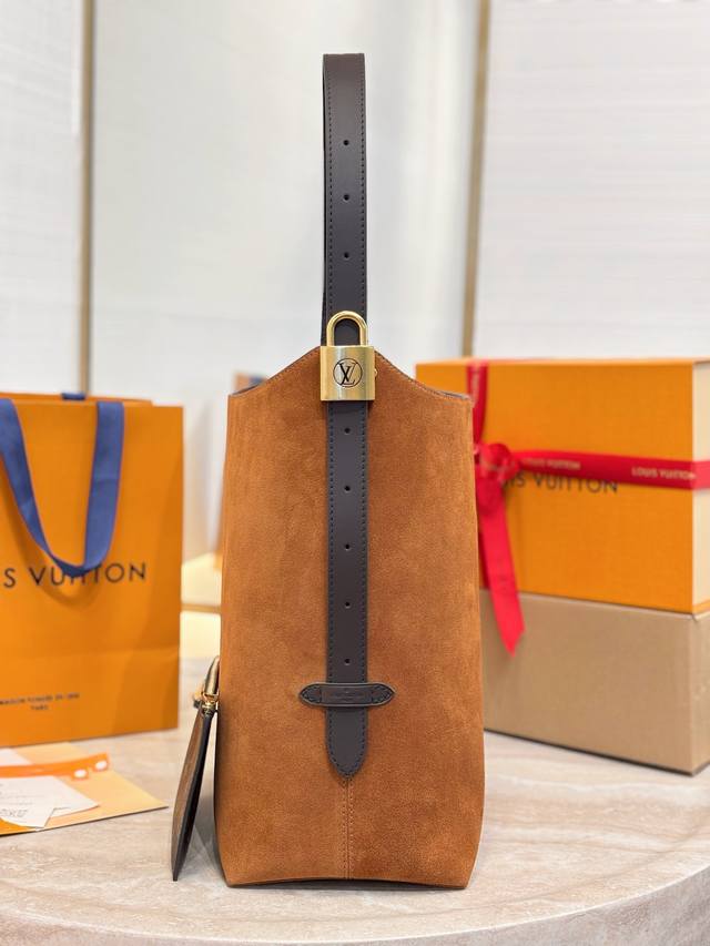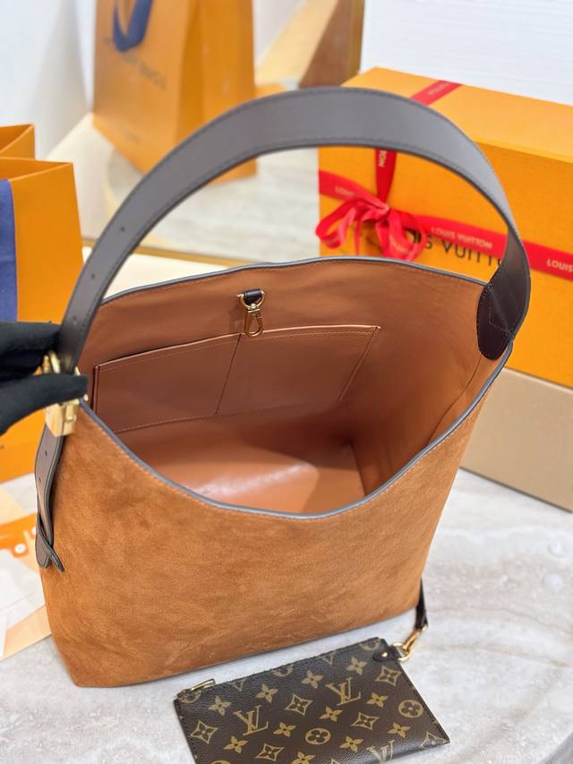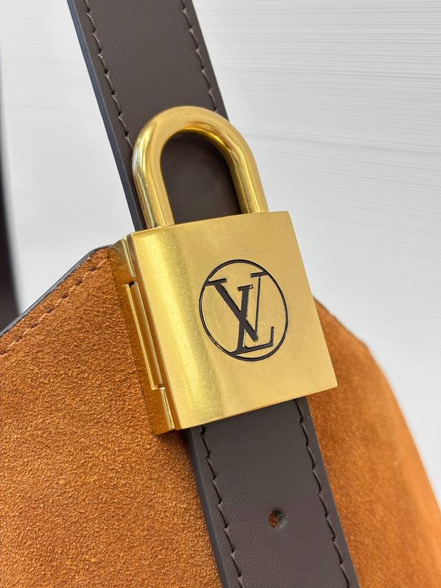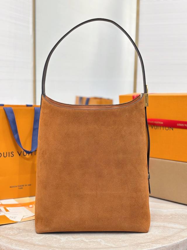 Hobo Medium Handbag DDD M25516 DDD This Hobo medium handbag is crafted from smooth suede cowhide leather, with a clean, tailored silhouette reminiscent of the bohemian aesthetics of the 1970s. Leather trim and an aged metal padlock add a touch of sophistication. An interior pocket and a detachable Monogram pouch make carrying everyday essentials easy. Size: 35 x 31 x 18 cm DDD