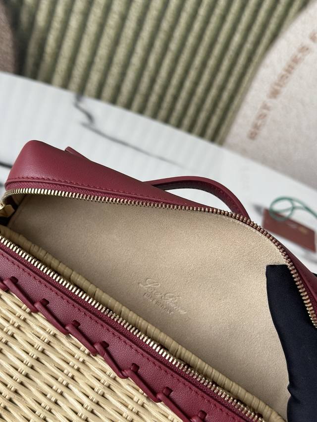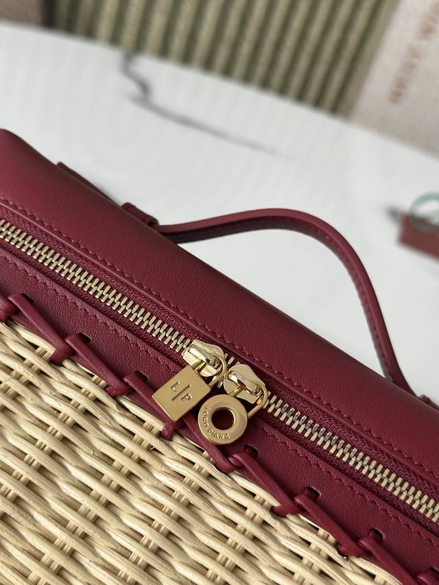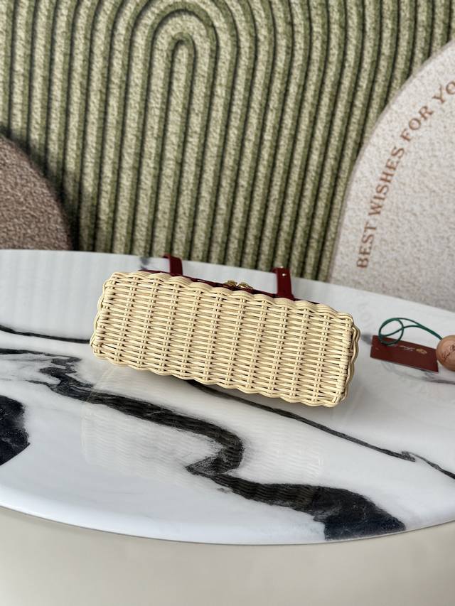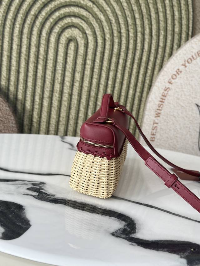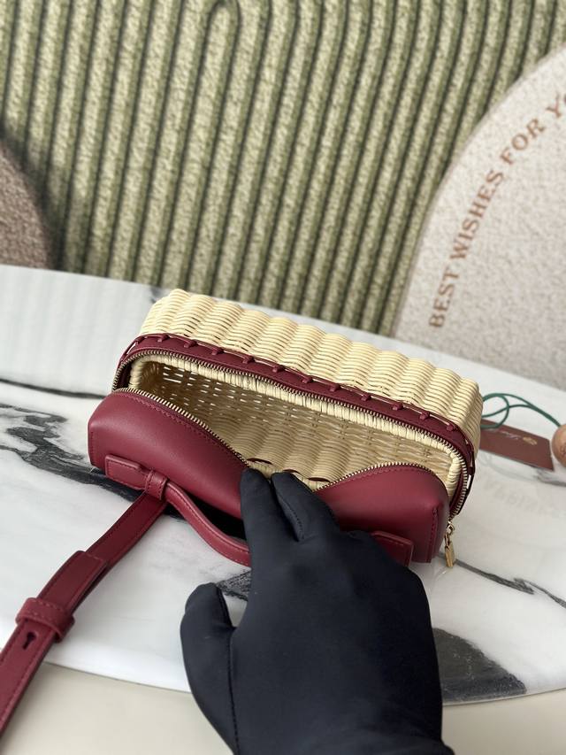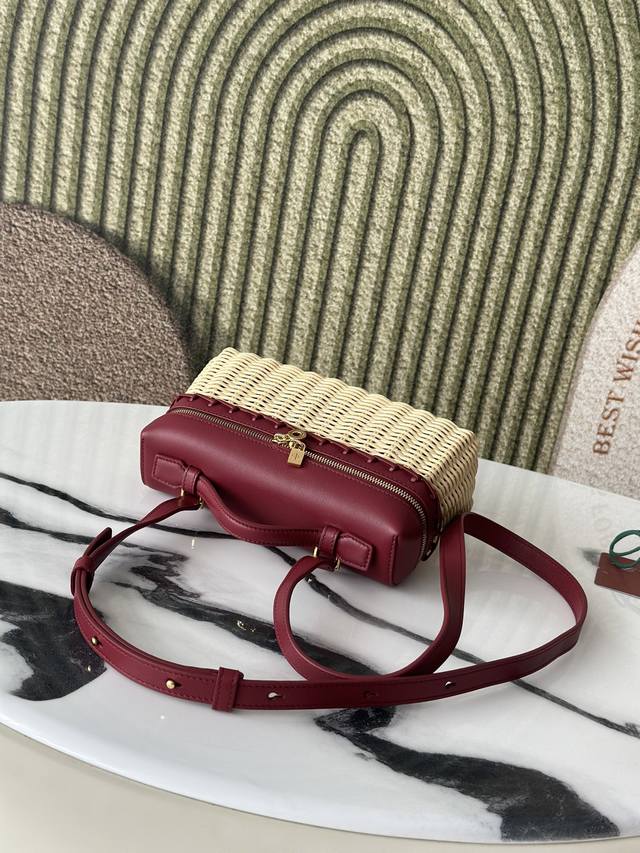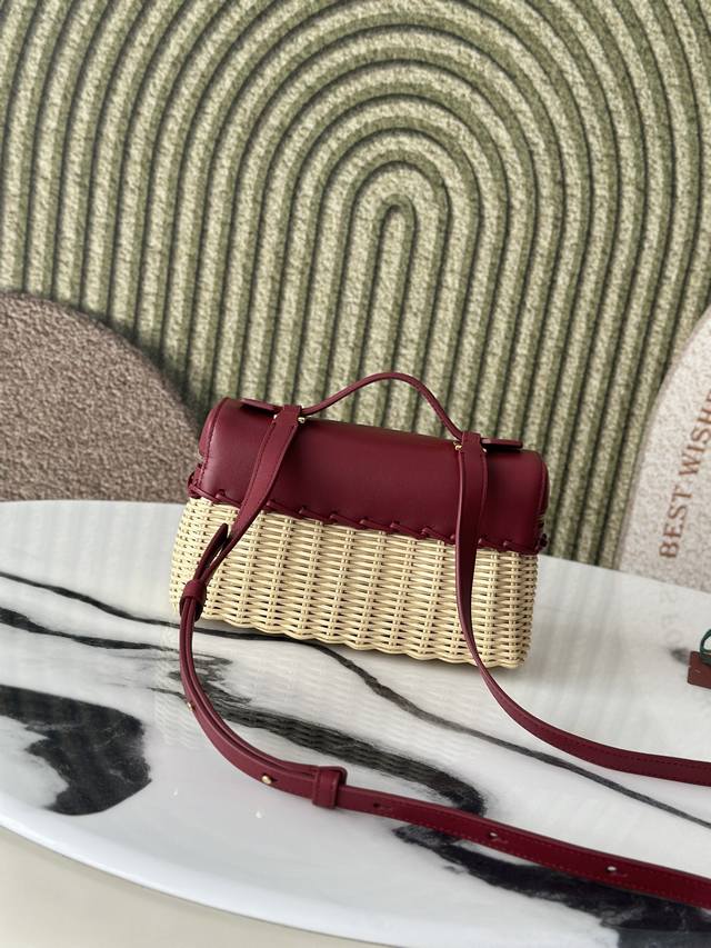 L19 Bamboo and Rattan Red Bean Extrapocket. This compact handbag combines handwoven bamboo with the brand's unique cowhide leather. Lightweight and versatile, the detachable shoulder strap allows for crossbody wear. Its classic design blends traditional weaving techniques with modern functionality, making it an ideal gift. Leather handles and shoulder strap. Two-way zipper closure with Mycharms detailing. Dimensions: 11 x 19 x 7 cm. Material: Bamboo fiber. Lining: Cowhide leather. Trim: Cowhide leather.