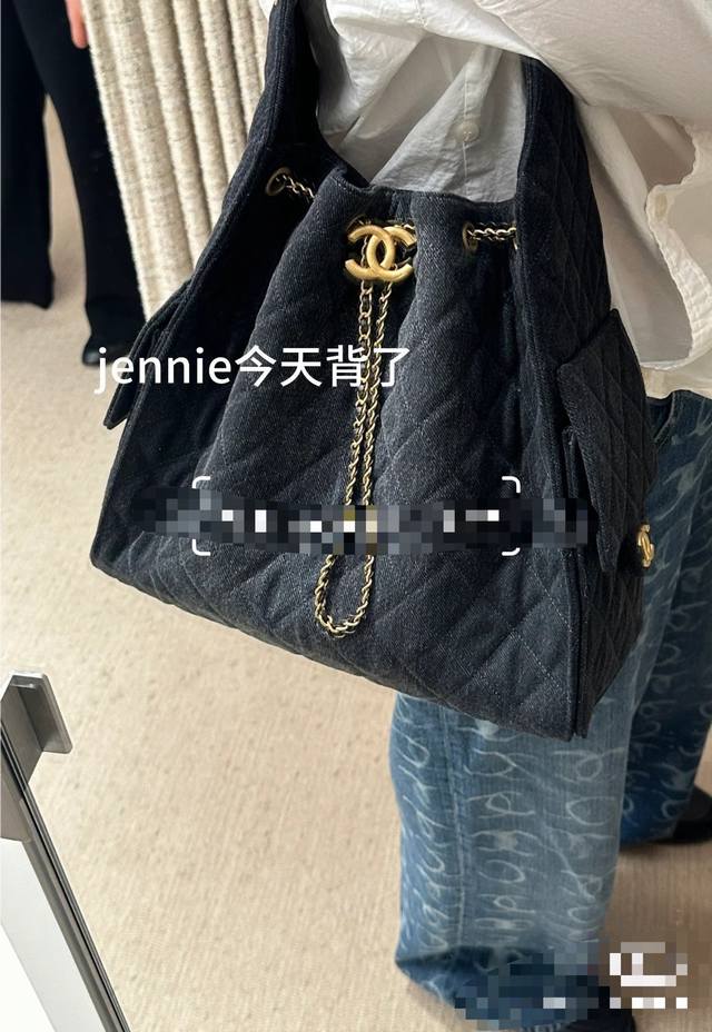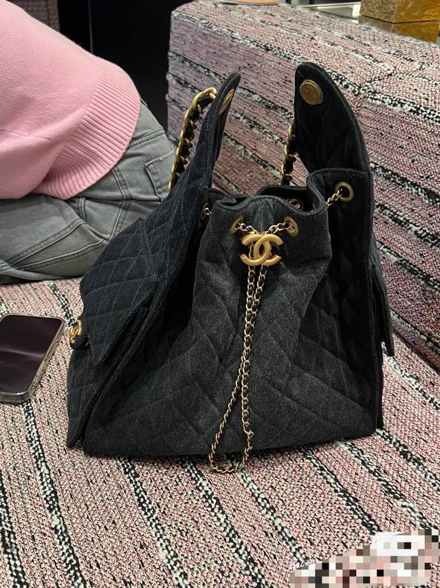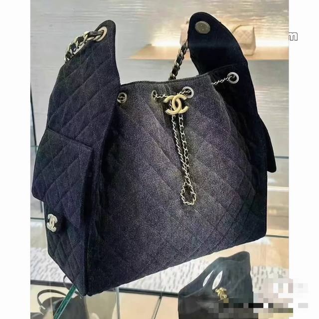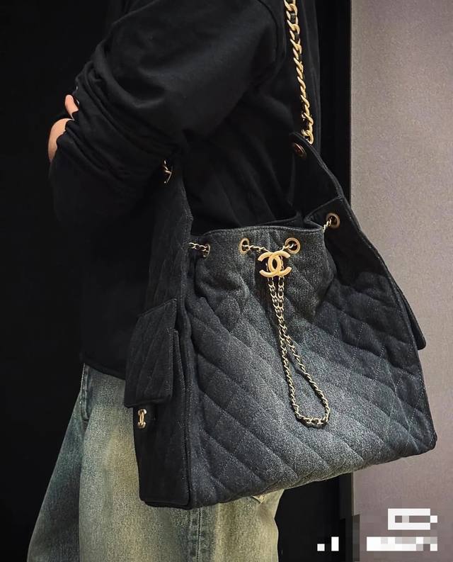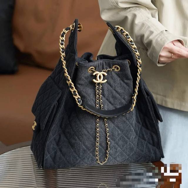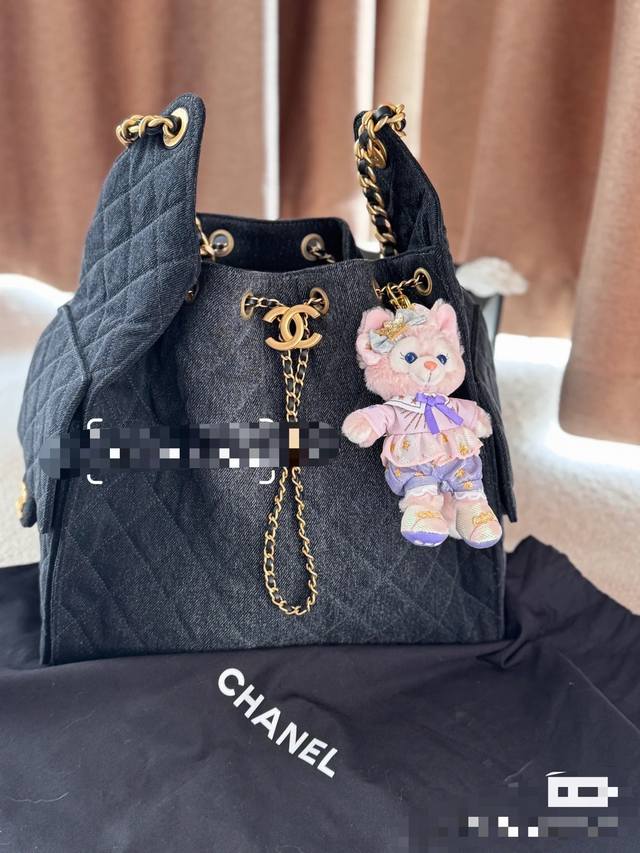 Large Size New Dark Denim Hippie Bag DDD Open top, drawstring, pockets, gold chain embellishment, unique design DDD Cool and stylish bucket bag shape, super large capacity and practical DDD Two side pockets, drawstring opening, adjustable DDD Washed denim material, rugged yet elegant style, with a metal double C logo buckle in the center of the bag, casual and youthful design DDD Dimensions: 40*30*15Cm 53110030*26*14Cm 529300 DDD