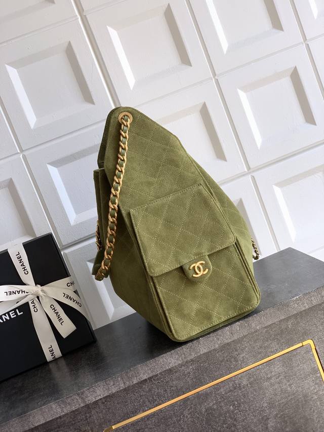 Large-sized matcha green early spring runway piece from Ohanel is here! A cute new addition to the Chanel collection, made of suede. Its main body is actually a small bucket bag, the leather of which is a soft, suede-like material. Perfect for carrying cute mini earphones, it seems like a deliberate and carefully chosen accessory. The large double-C logo design is adjustable! Charming details include a non-adjustable chain, gold accents, and vintage-finished hardware, giving it a truly vintage feel. An absolutely stunning piece: 5311 DDD